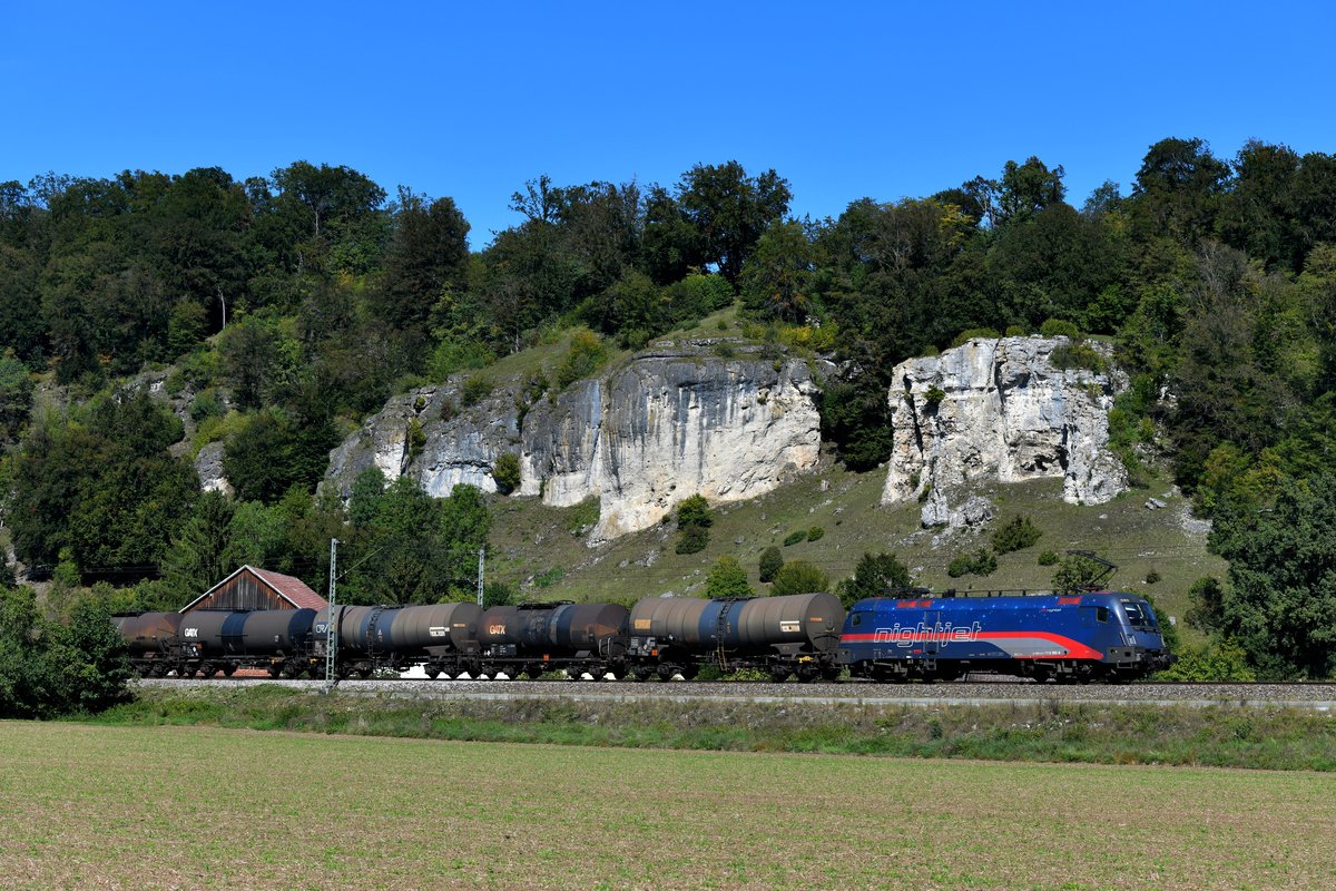 Auch wenn es nach einem Kesselwagenzug aussieht: Am 18. September 2019 hatte die 1116.195 einen gemischten Güterzug aus dem Ruhrgebiet nach Wien Zvb am Haken. Die Leistung wurde aufgrund von Bauarbeiten zwischen Nürnberg und Regensburg über das Altmühltal umgeleitet. Bei Hagenacker konnte ich den richtig herum stehenden "nightjet"-Taurus vor einer für die Gegend typischen Felsformation aufnehmen. Christoph Schneider
