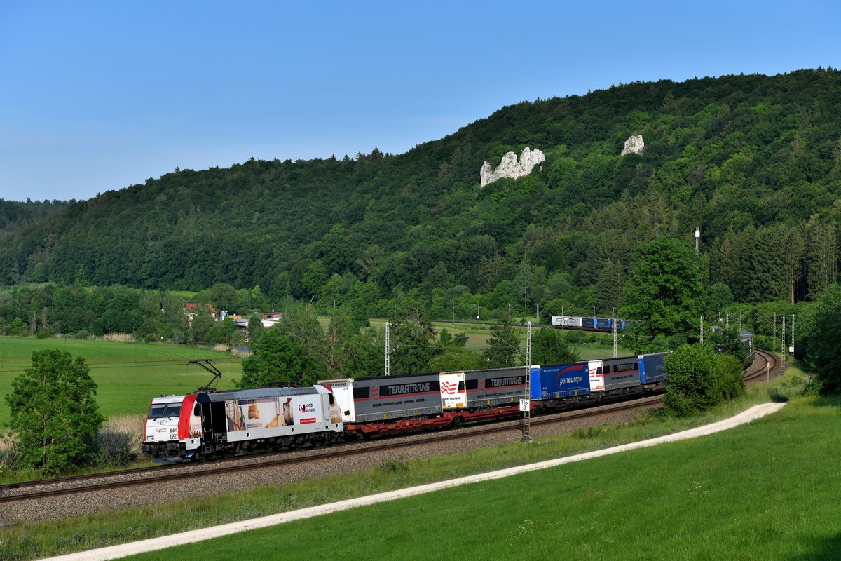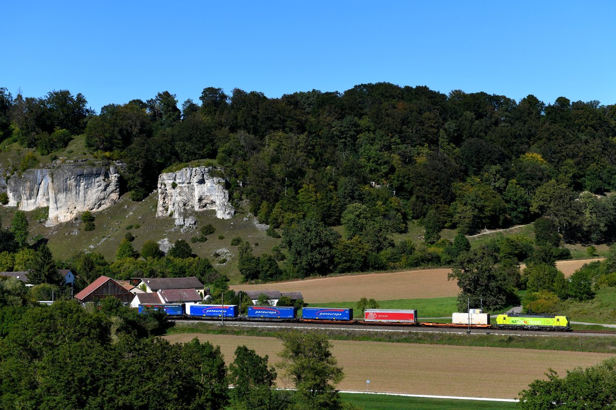 Der DGS 43820 von Verona Q.E. nach Bremen Grolland wurde am 05. Juni 2019 ab München Ost Rbf von der 185 664 bespannt. Der unter Eisenbahnfreunden umgangssprachlich auch als "Bremer" oder "Paneuropa / Terratrans KLV" bekannte Zug nahm an diesem Tage baustellenbedingt den Weg über Ingolstadt und das Altmühltal. Bei Dollnstein konnte ich die gut ausgelastete Leistung in für die Region typischer Landschaft aufnehmen. Christoph Schneider