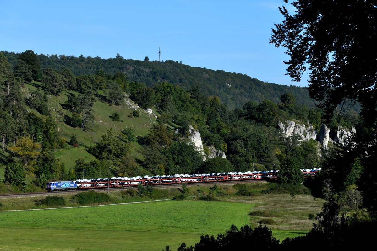 Mit dem nachmittäglichen Neuwagentransport GA 60044 von Ingolstadt Hbf nach Osnabrück Rbf Oro war am 18. September 2019 die Albatros 152 138 bei Hagenacker im Naturpark Altmühltal zu beobachten. Christoph Schneider