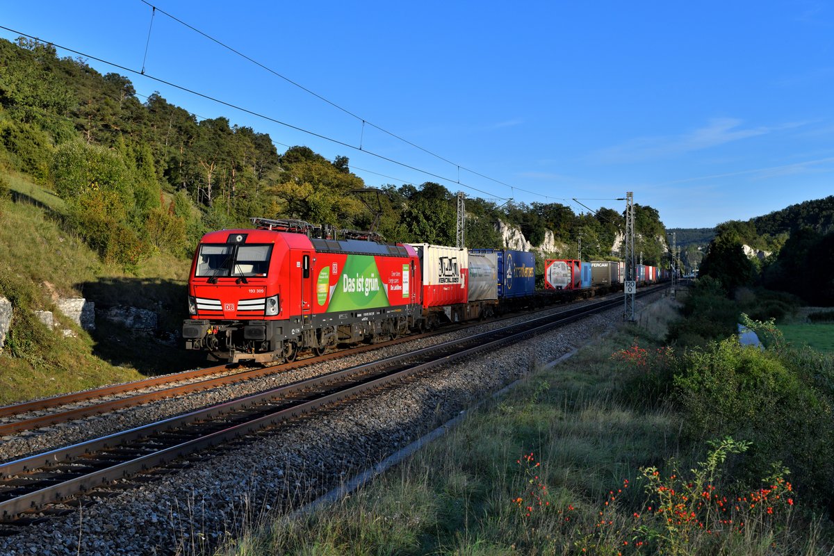 Wenige Augenblicke vor Sonnenuntergang gab es am 18. September 2019 bei Hagenacker im Altmühltal noch eine "Spot-Beleuchtung" für die 193 309. Der auf einen Energiespar-Wettbewerb unter Lokführern bei DB Cargo hinweisende Vectron bespannte den KLV-Zug KT 40558 von Verona Q.E. nach Rotterdam Waalhaven über den gesammten Laufweg hinweg. Christoph Schneider