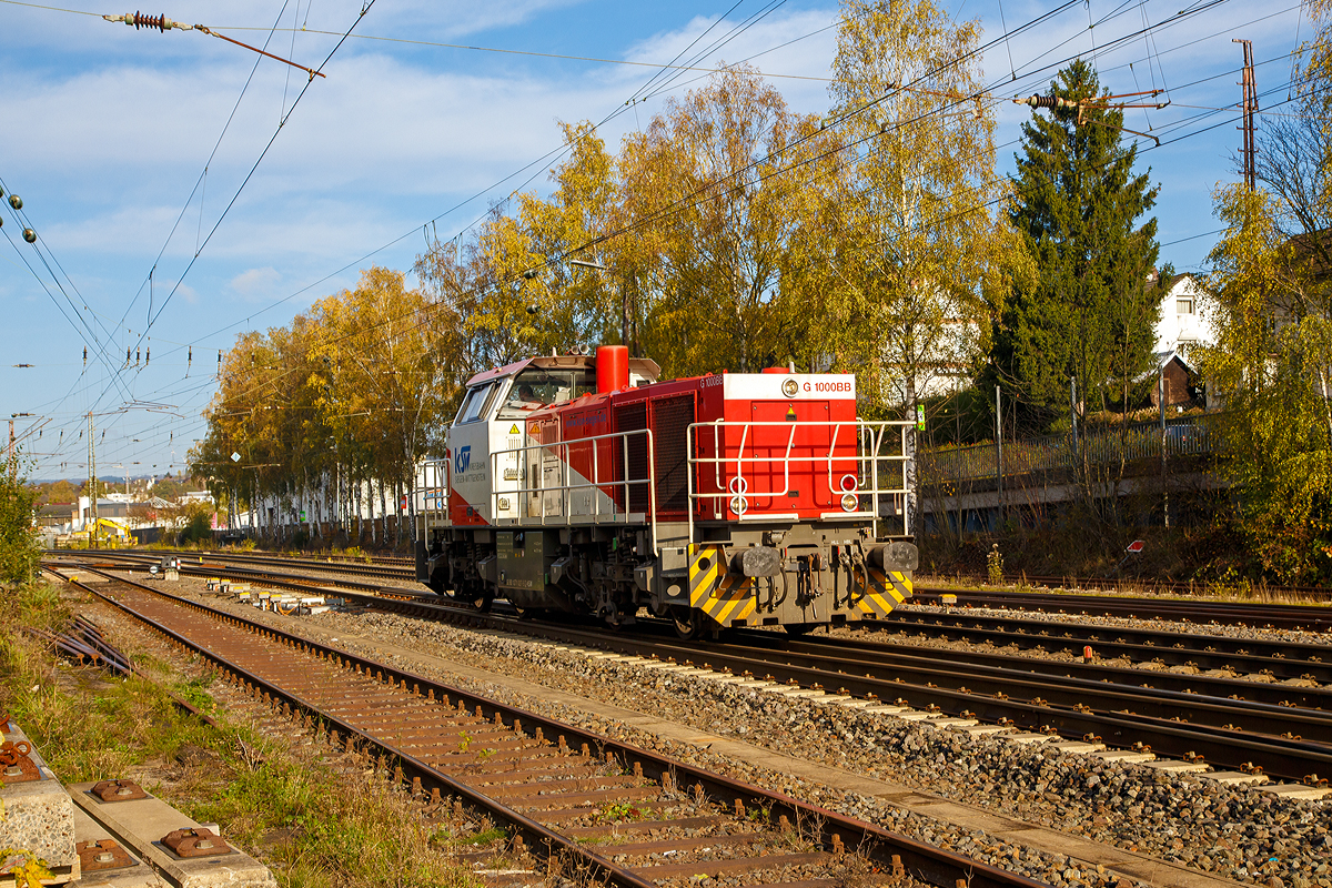 Die KSW 47 (92 80 1271 027-5 D-KSW), ex D 2 der HFM, eine Vossloh G 1000 BB der KSW (Kreisbahn Siegen-Wittgenstein), am 30.10.2019 auf Rangierfahrt in Kreuztal.