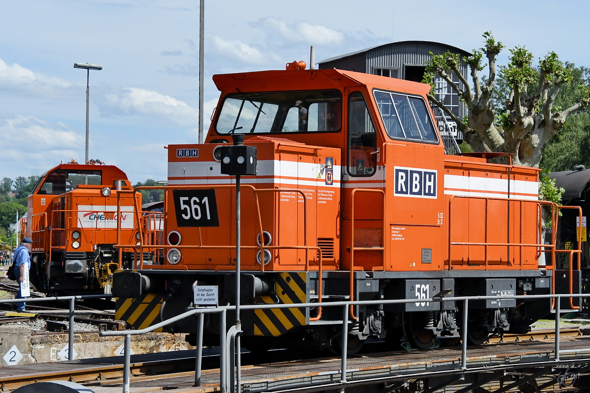 MaK DE 502 "561" wird auf der Drehscheibe präsentiert, im Hintergrund wartet eine Alstom H3-Hybridlokomotive. (Eisenbahnmuseum Bochum, Juni 2019) Christian Bremer