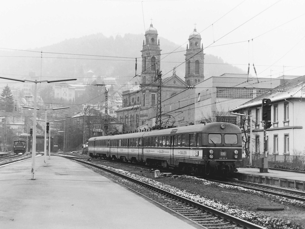 Noch ein Schätzcken von Rudolf Pavel, im Hintergrund ist die Ortsansässige Köf an Gleis4 zu erkennen, während an Gleis 1 der 425 117 gen Lindach ausfährt. Das Bild entstand am 30.11.1980 in Eberbach. Andreas Strobel