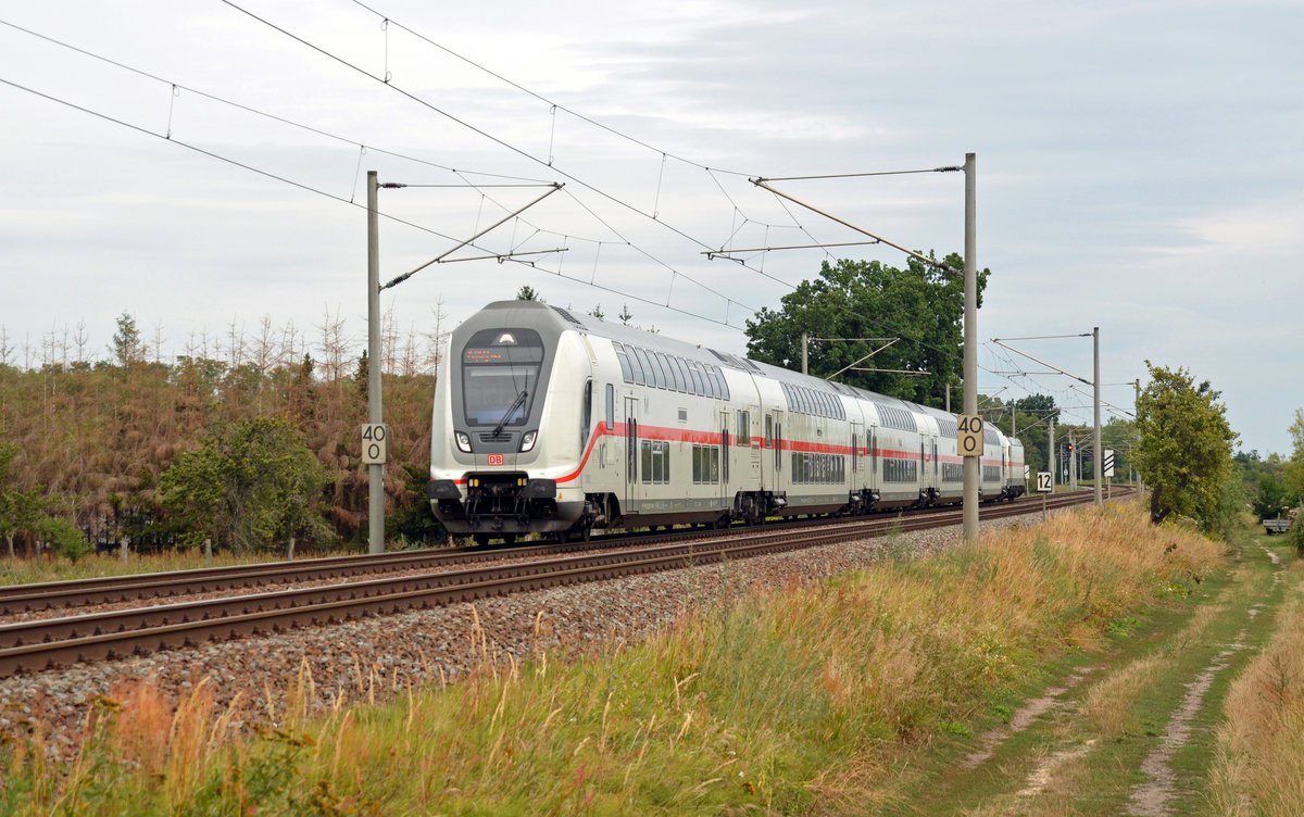 DBpbzfa 668.2 mit Schublok 146 556-6 DB als IC 2038 (Linie 56) von Leipzig Hbf nach Emden Hbf durchfährt den Bahnhof Güterglück auf der Bahnstrecke Biederitz–Trebnitz (KBS 254).