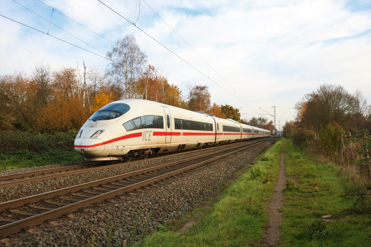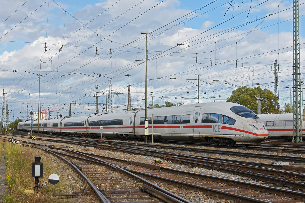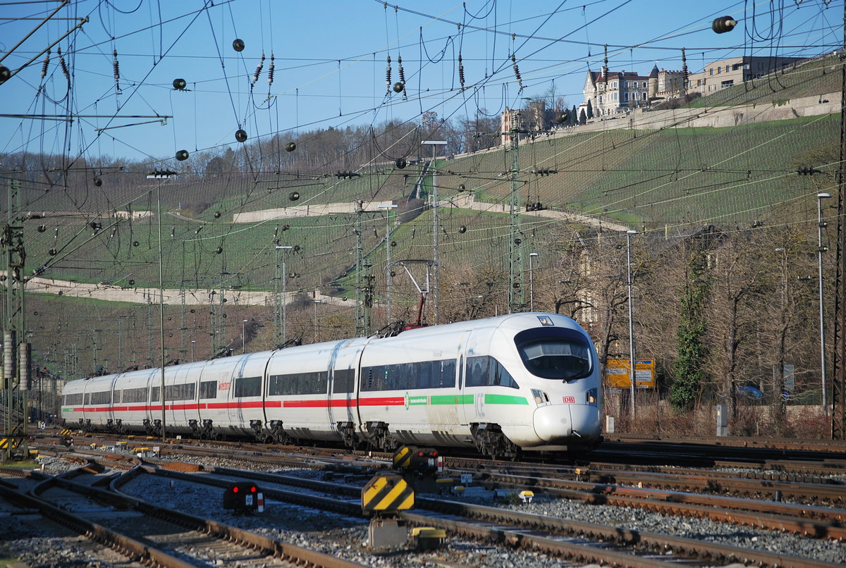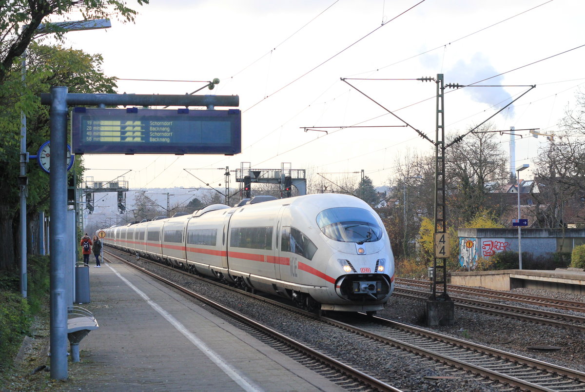 Nachschuss auf zwei 403 als ICE 519 (Linie 42) von Dortmund Hbf nach München Hbf, die die Überleitstelle (Üst) Markgröningen Glems auf der Schnellfahrstrecke Mannheim–Stuttgart (KBS 770) passieren.