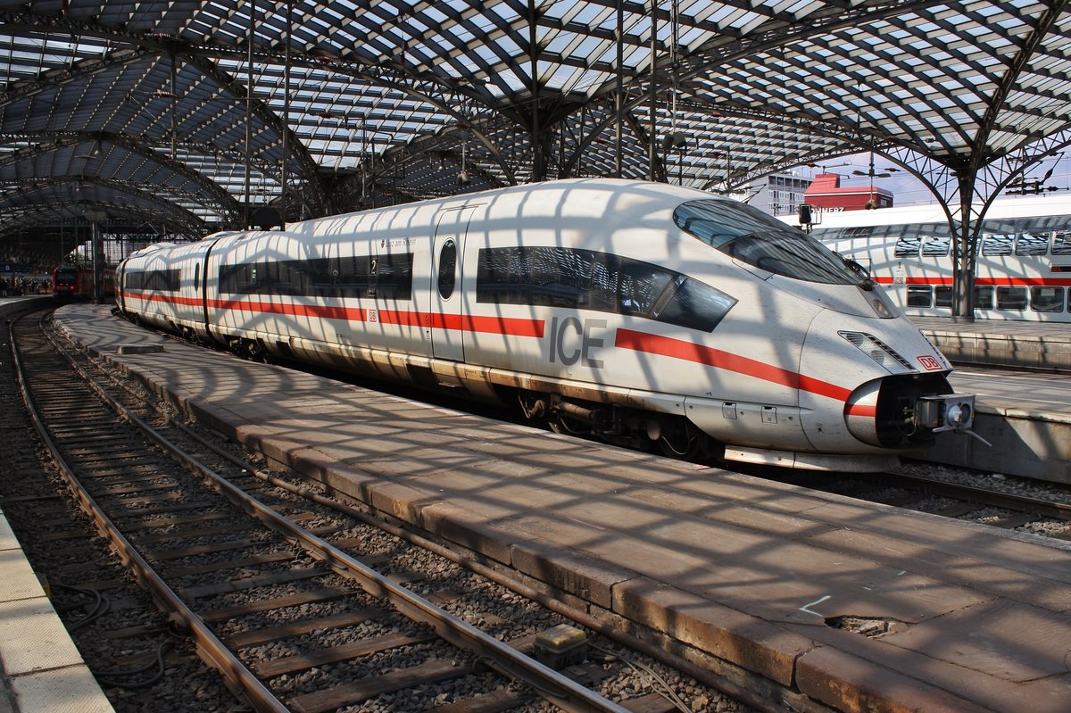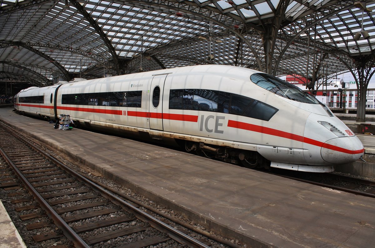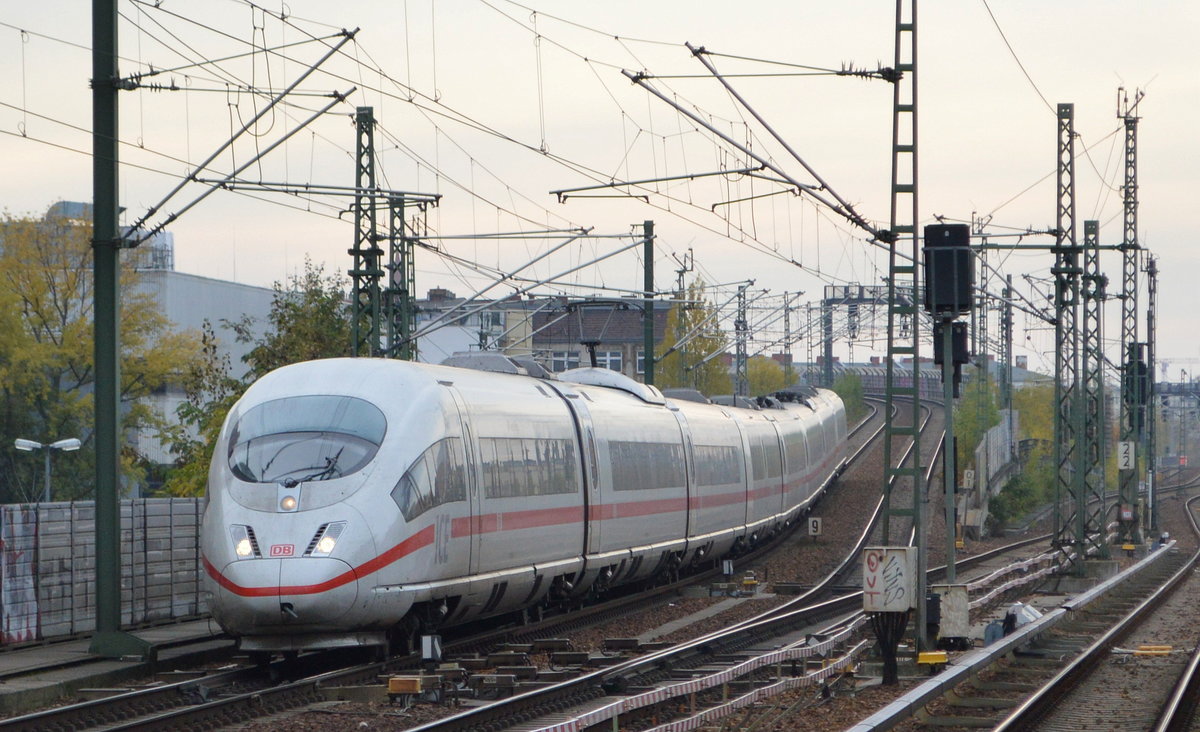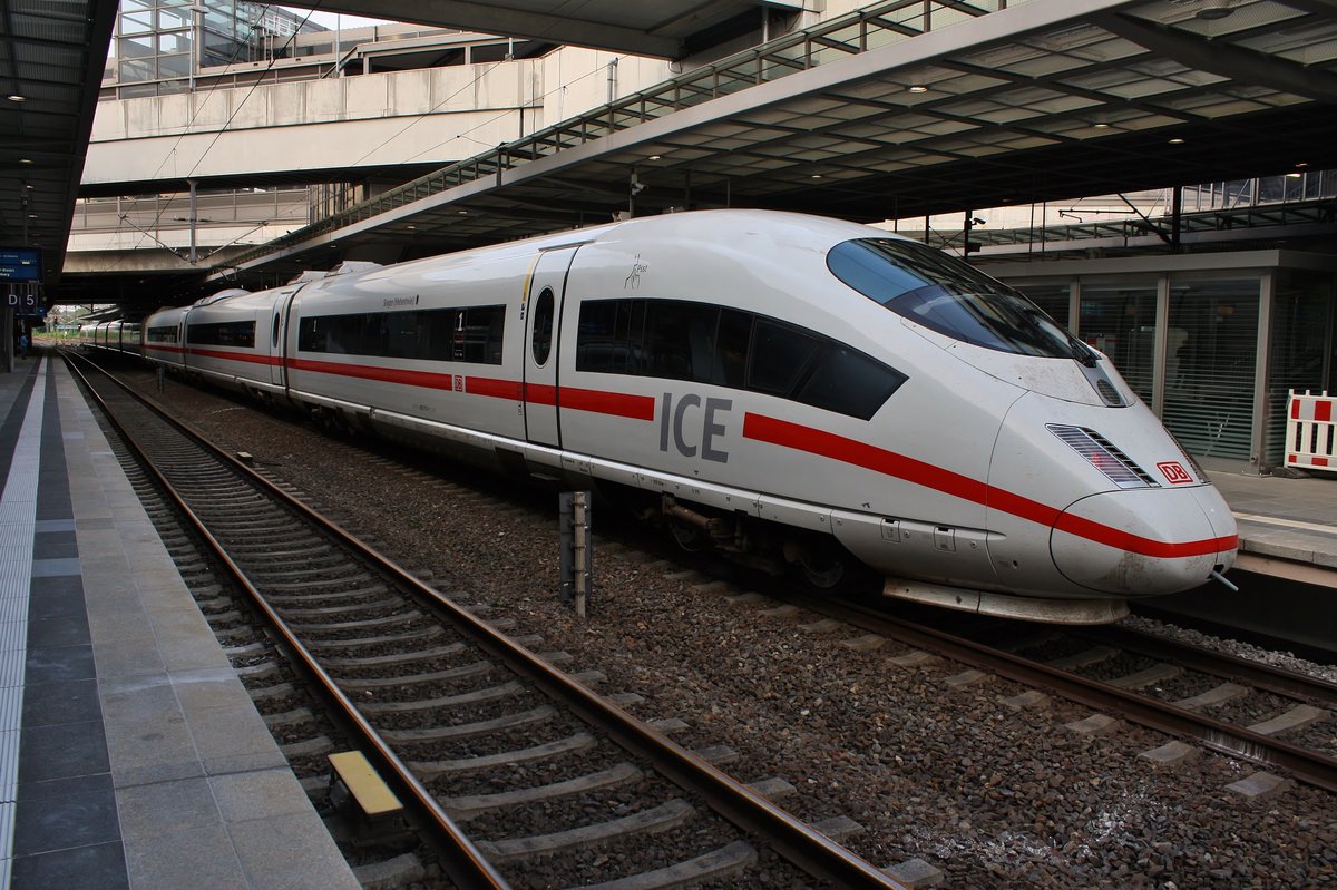 Nachschuss auf zwei 403 als ICE 519 (Linie 42) von Dortmund Hbf nach München Hbf, die die Überleitstelle (Üst) Markgröningen Glems auf der Schnellfahrstrecke Mannheim–Stuttgart (KBS 770) passieren.
