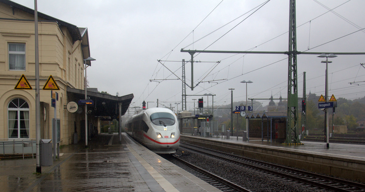 Der ICE3 DB aus Frankfurt am Main nach Brüssel-Süd kommt durch Kohlscheid als Umleiter aus Richtung Mönchengladbach,Herzogenrath und fährt in Richtung Aachen-West,Hbf und fährt die Kohlscheider-Rampe hoch. Aufgenommen von Bahnsteig 1 in Kohlscheid.