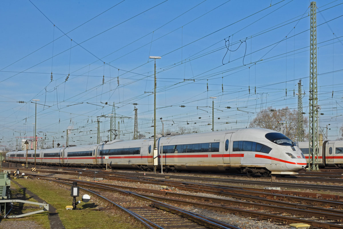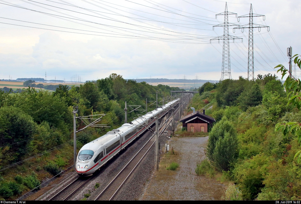 Zwei 403 als ICE 519 (Linie 42) von Dortmund Hbf nach München Hbf passieren die Überleitstelle (Üst) Markgröningen Glems auf der Schnellfahrstrecke Mannheim–Stuttgart (KBS 770).