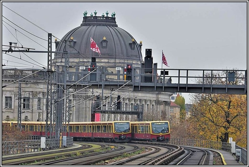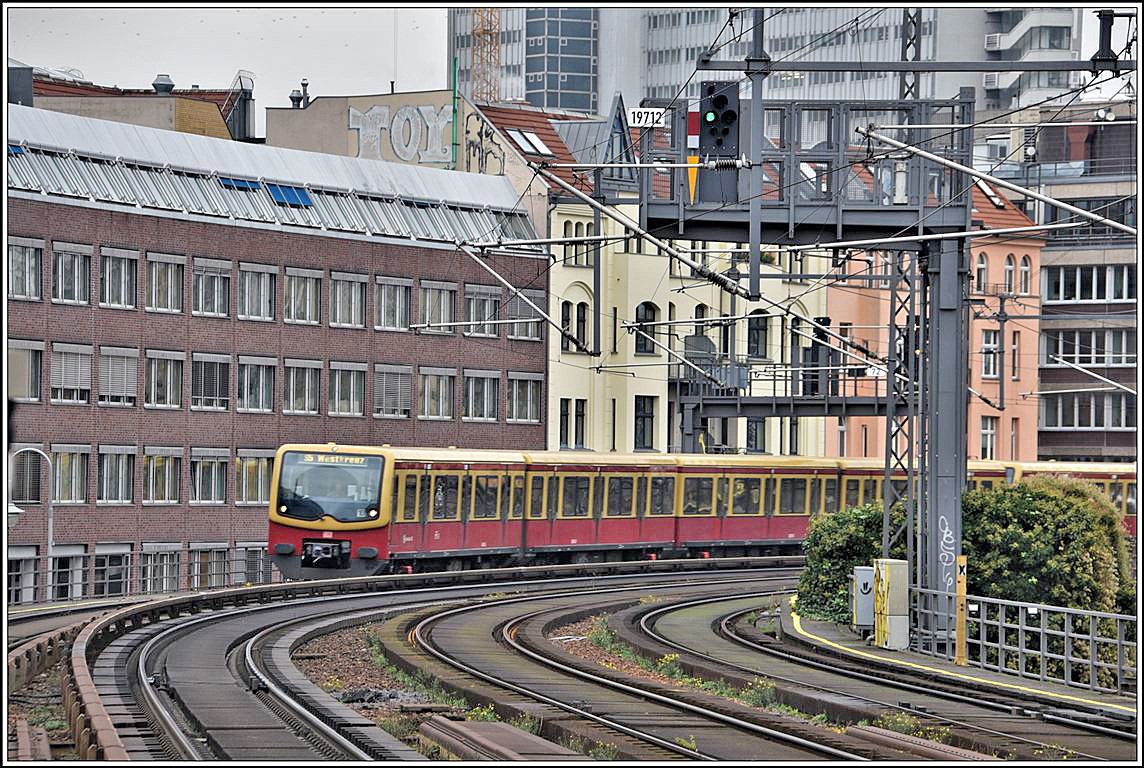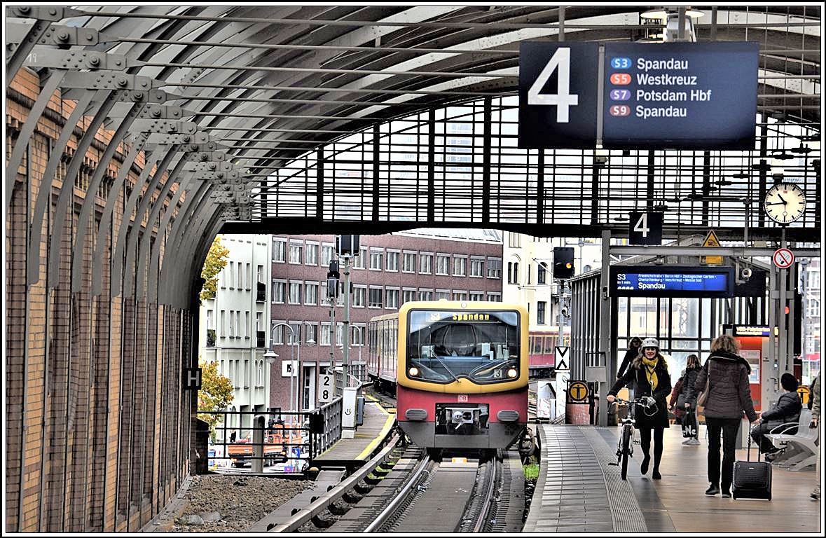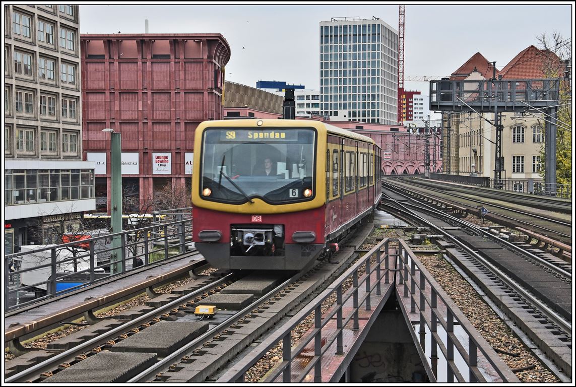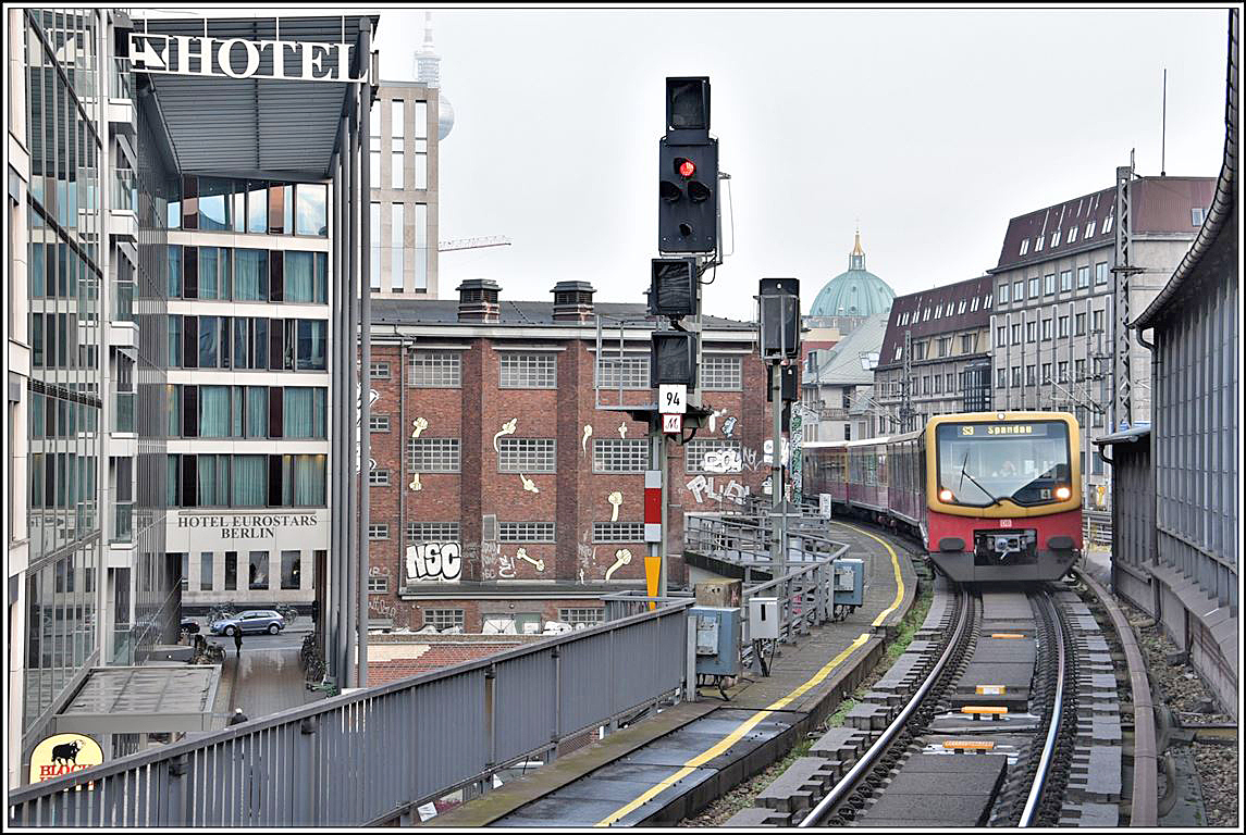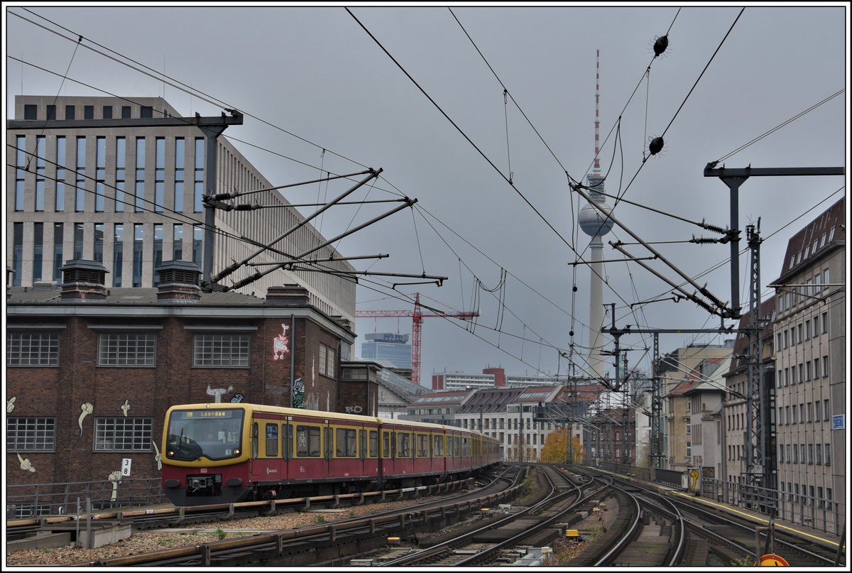 S9 nach Spandau fährt in Berlin Friedrichstrasse ein. Im Hintergrund der von der DDR erbaute Fernsehturm beim Bahnhof Alexanderplatz. (18.11.2019) Herbert Graf