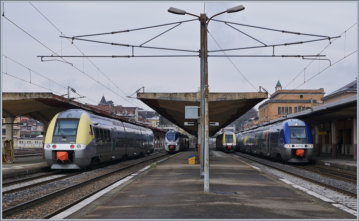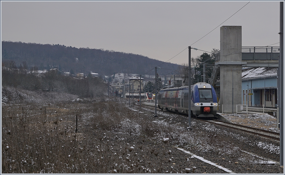 Der Z 27534/533 erreicht, als TER 84770 von Evian nach Lyon fahrend, den Bahnhof Thonon-les-Bains. Der Zug befährt gerade den Übergang, welcher vom Empfangsgebäude mit dem Hausbahnsteig A zum Bahnsteig B führt. Der Übergang kann ohne Einschränkungen benutzt werden, nur bei der Annäherung eines Zuges verbieten rot aufleuchtende Lampen auf Bodenhöhe die Nutzung. Dies mag für den TGV und TER Verkehr zweckvoll sein, für das bald kommende LÉMAN-EXPRESS Zeitalter aber wird nun ein schienenfreier Zugang zum Bahnsteig B gebaut werden.