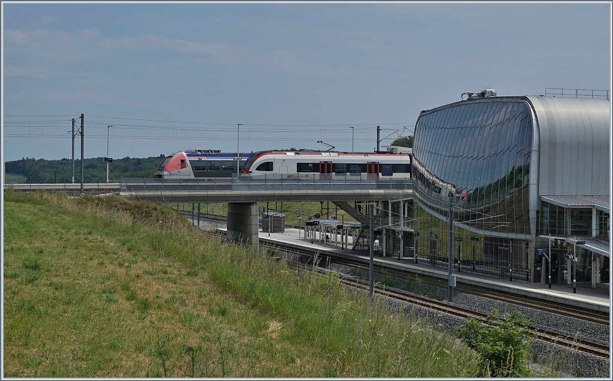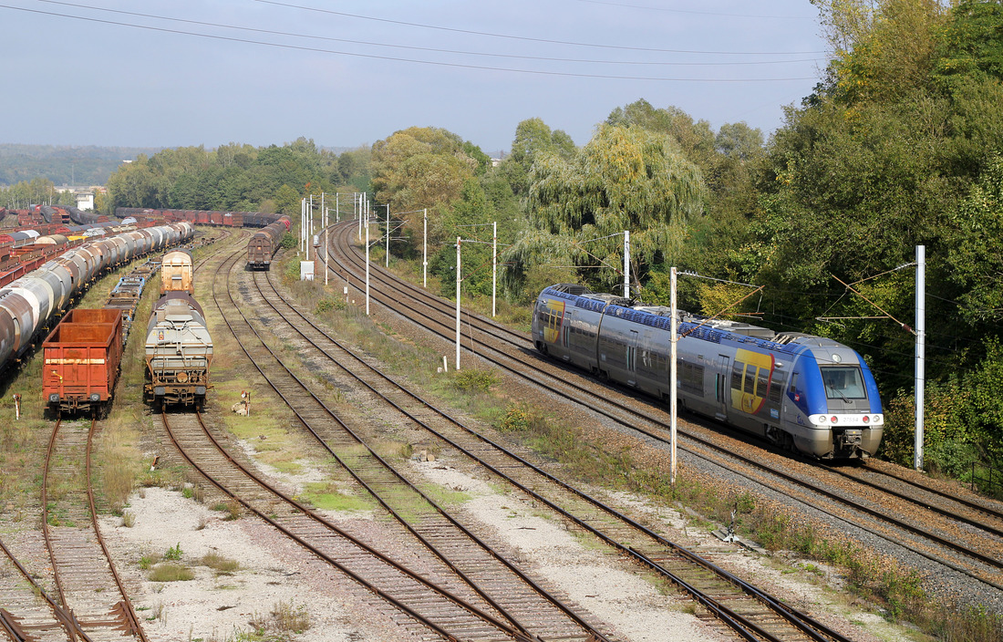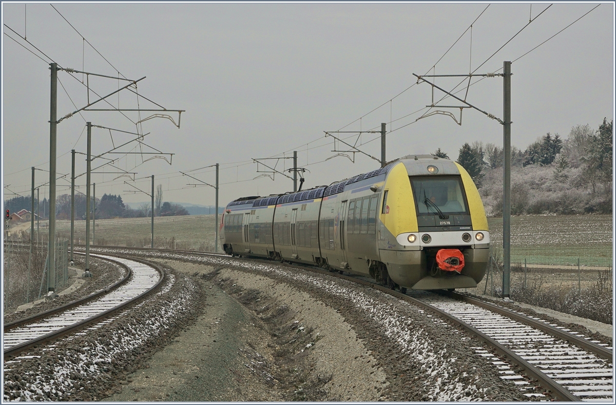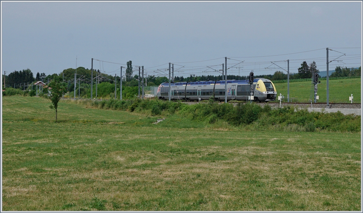 Während ein paar hundert Meter von hier TGV Züge geradewegs durchs Land sausen, bummelt der Z 27736/735 gemütlich als TER 895059 von Belfort nach Meroux. Das Bild entstand bei der Einfahrt in den Bahnhof von Meroux TGV, im Hintergrund ist der alte Bahnhof zu erkennen.