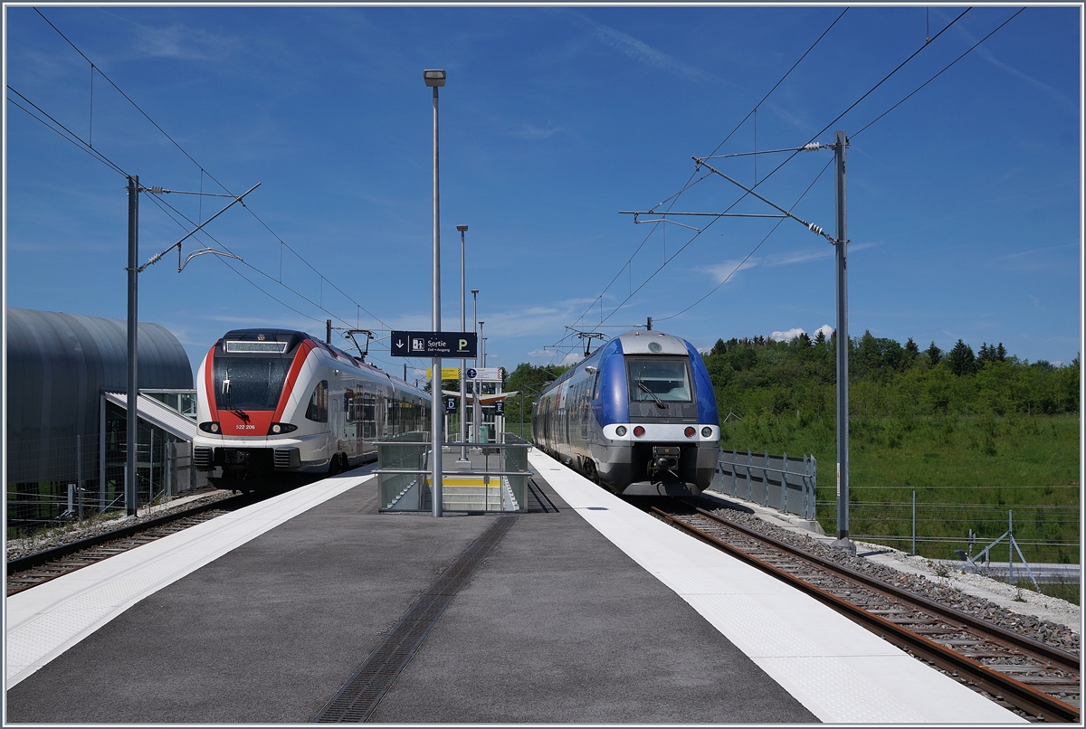 SNCF Z 27569 als TER 89054 nach Belfort und der SBB RABe 522 209 als RE 18173 nach Biel/Bienne warten in Meroux auf die unmittelbar bevorstehende Abfahrt.