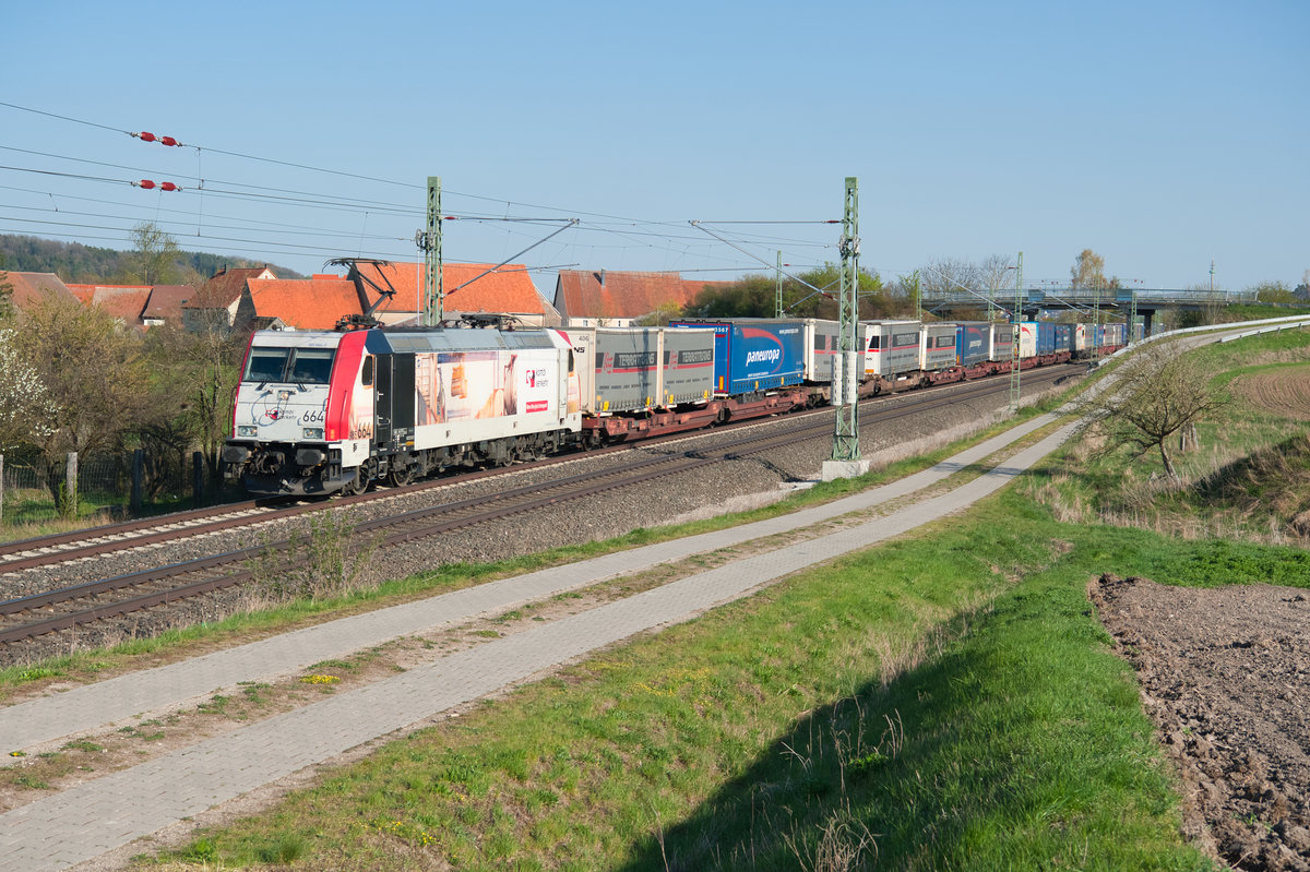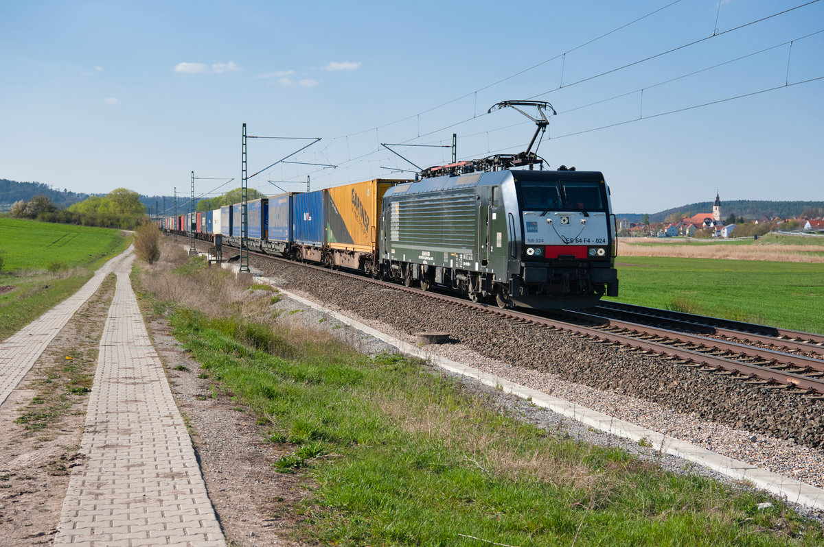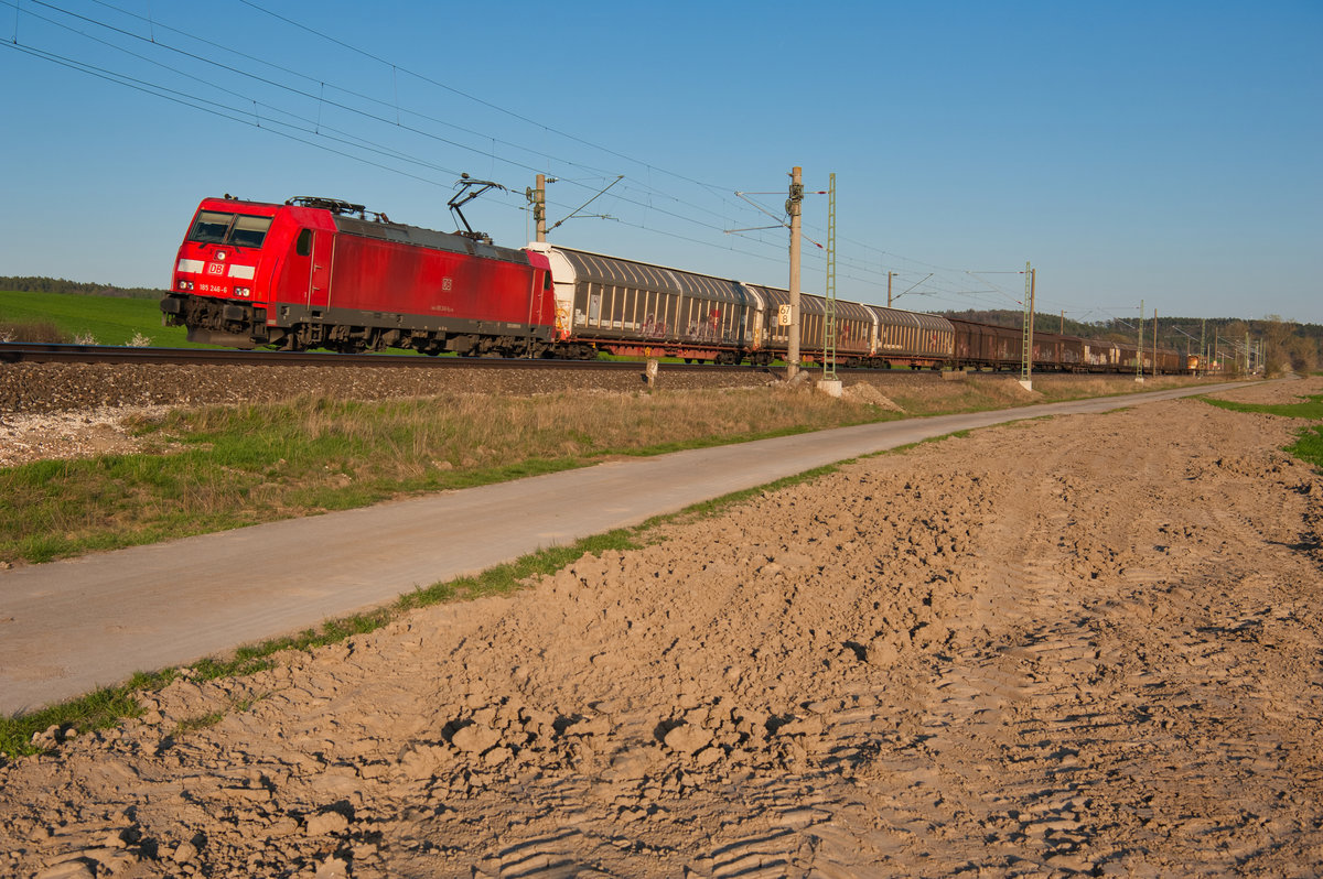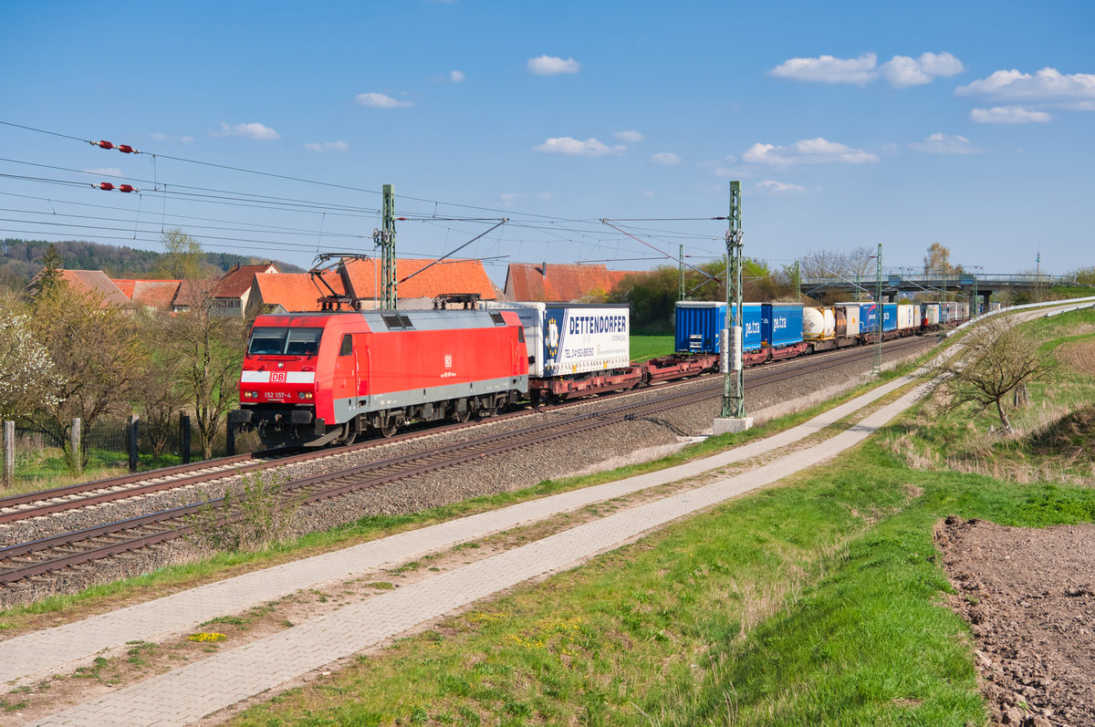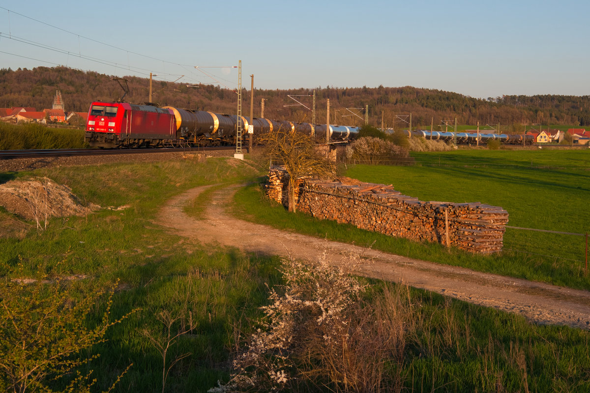 185 246 mit einem gemischten Güterzug bei Oberdachstetten Richtung Würzburg, 18.04.2019