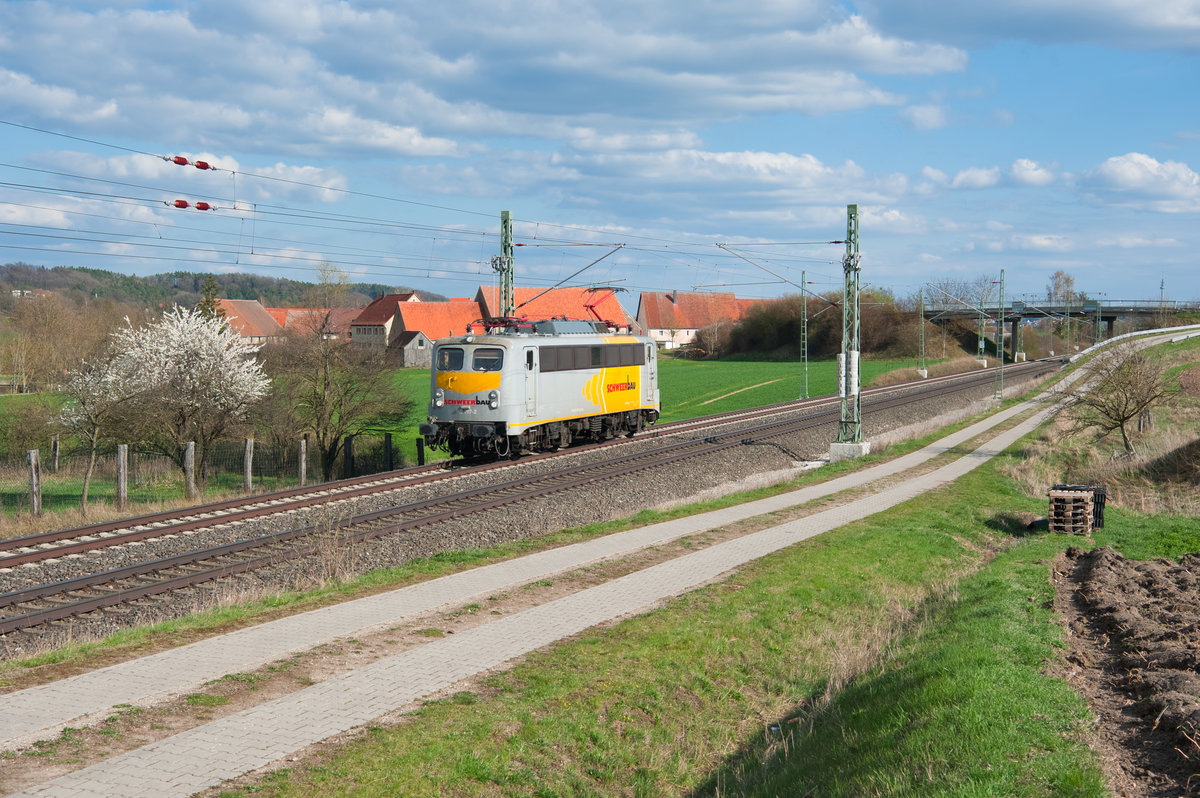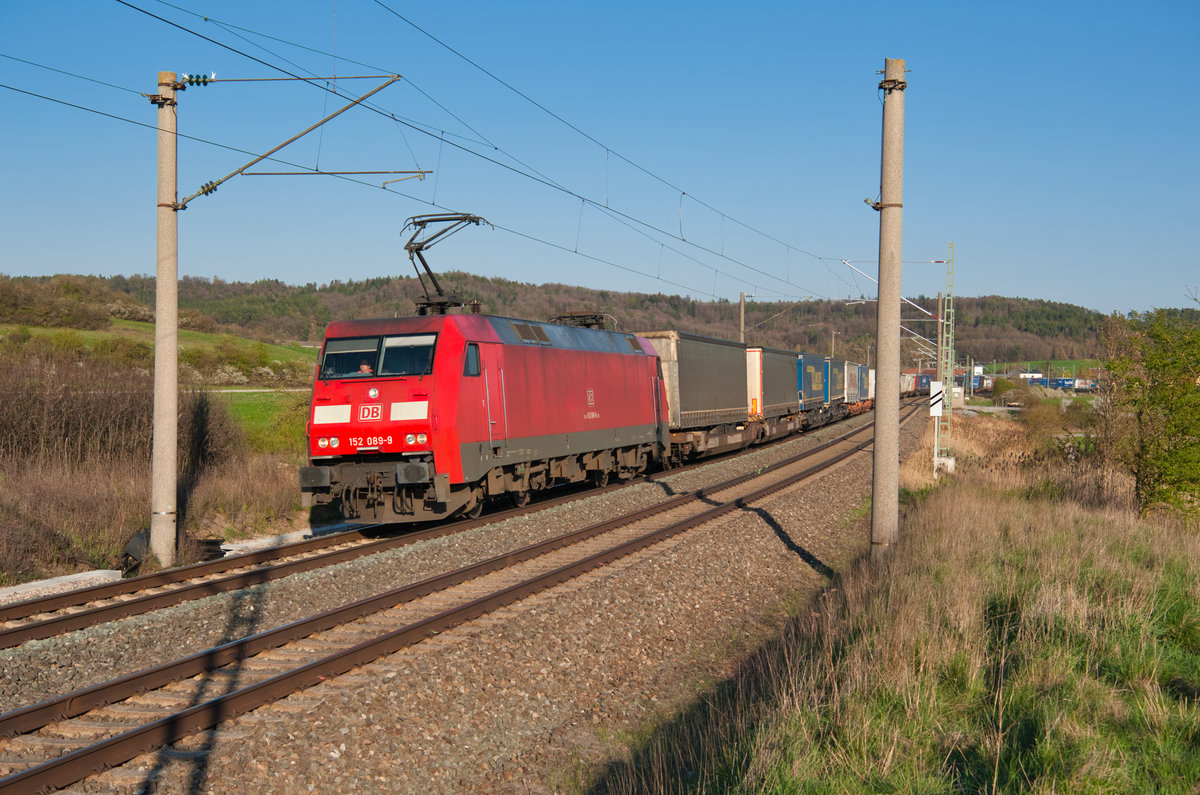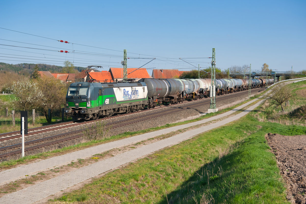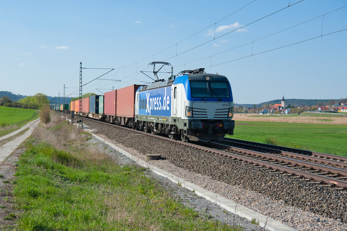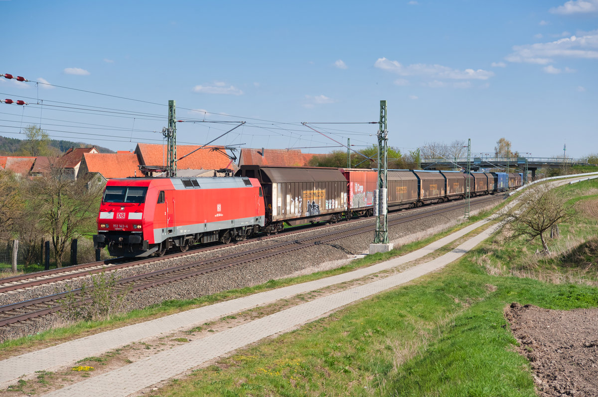 185 246 mit einem gemischten Güterzug bei Oberdachstetten Richtung Würzburg, 18.04.2019