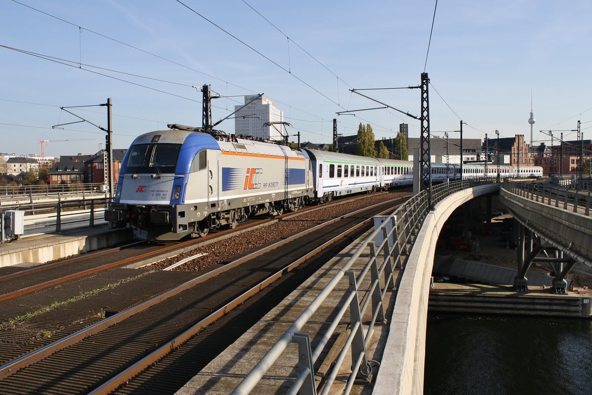 370 007 durchfährt am 31.10.2019 mit dem EC54 von Gdynia Glowna nach Berlin Hauptbahnhof den Bahnhof Berlin Friedrichstraße in Richtung Westen. Alexander
