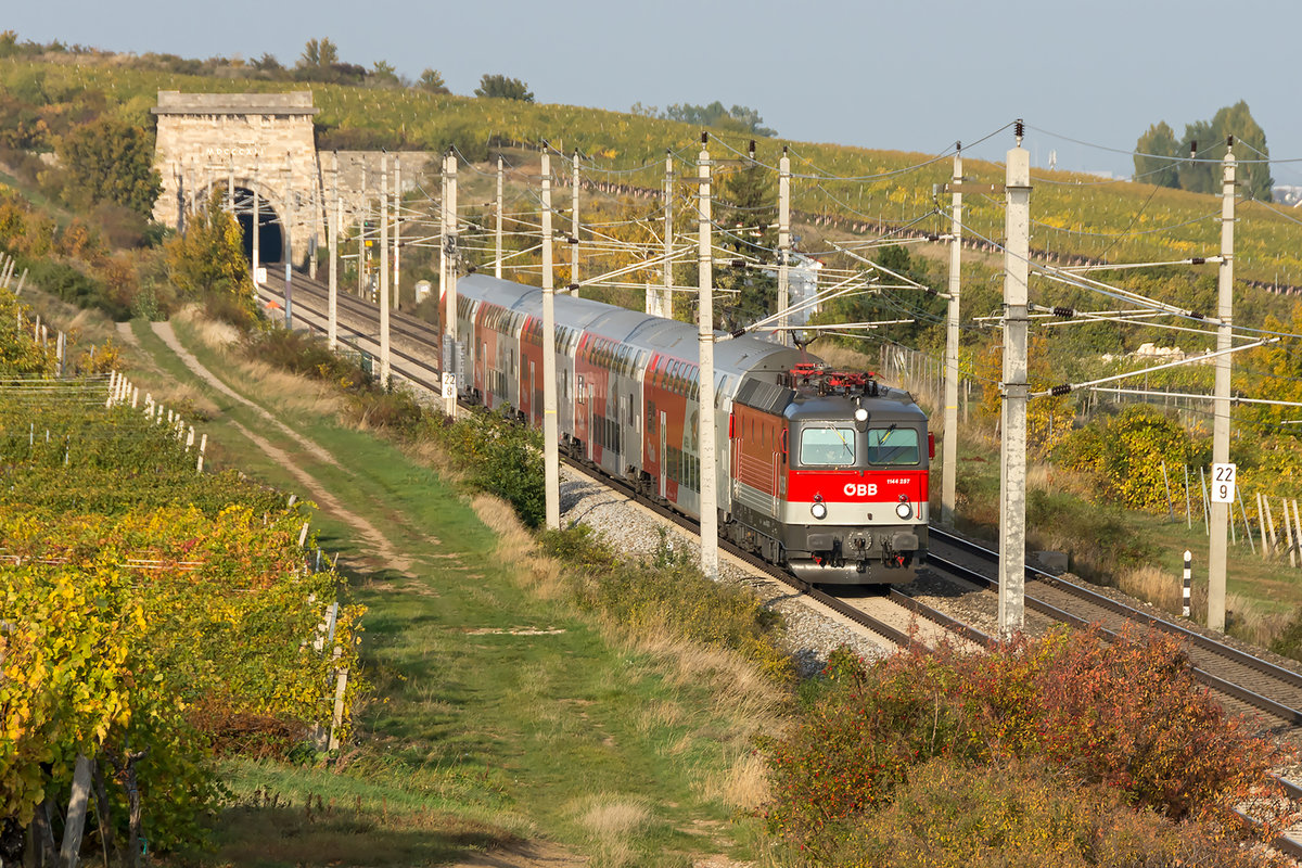 1144 257 hat mit dem R 2347 soeben den sogenannten "Busserltunnel" zwischen Gumpoldskirchen und Pfaffstätten hinter sich gelassen. Das Foto entstand am 18.10.2019. Gerhard Zant