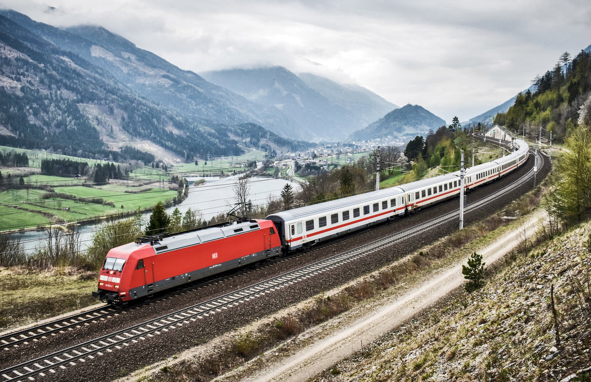 Der EC 114 "Wörthersee" (Klagenfurt Hbf - Dortmund Hbf) fährt mit 101 021-4 am Zugschluss, bei Penk, die Tauernbahn hinauf.