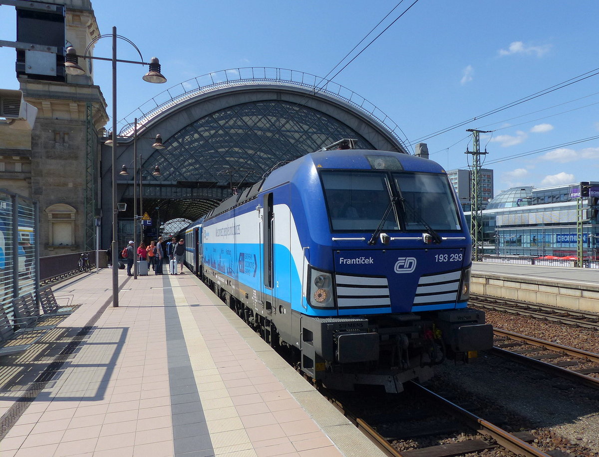 ČD - České dráhy a.s mit der ELL Vectron "193 297" [Name: Seppl][NVR-Nummer: 91 80 6193 297-9 D-ELOC] und EC aus Prag am 20.05.19 Durchfahrt Bf. Flughafen Berlin-Schönefeld.