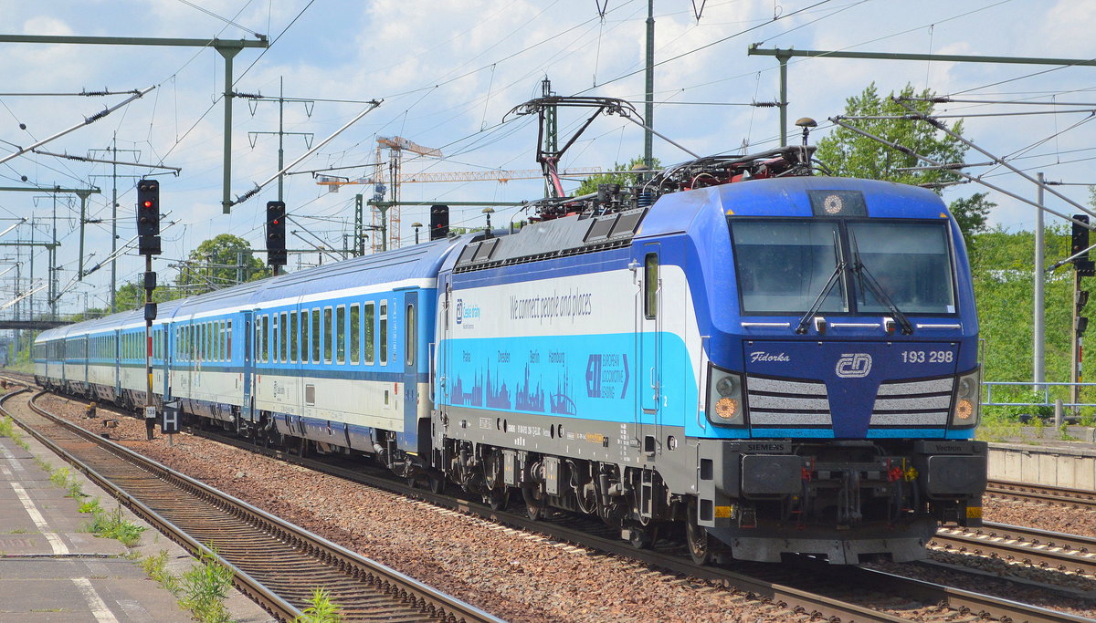 ČD - České dráhy a.s. mit der ELL Vectron "193 298" [Name: Fidorka][NVR-Nummer: 91 80 6193 298-7 D-ELOC] mit EC aus Prag Richtung Berlin am 21.05.19 Bf. Flughafen Berlin-Schönefeld. Lothar Stöckmann