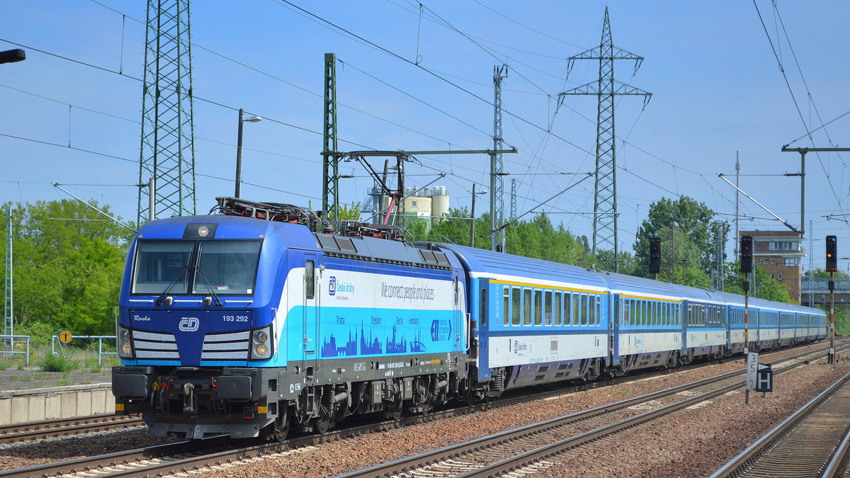 Durch die Bahnbaustelle in Teltow wird im Moment der DB Fernverkehr Richtung Süden und der stündlich verkehrende EC von und nach Prag über den BF. Flughafen Berlin-Schönefeld (Berliner Außenring) umgeleitet, hier die CD mit der ELL Vectron "193 292" [Name: Ronka] [NVR-Nummer: 91 80 6193 292-0 D-ELOC] Richtung Tschechien am 21.05.19 Bf. Flughafen Berlin-Schönefeld. Lothar Stöckmann