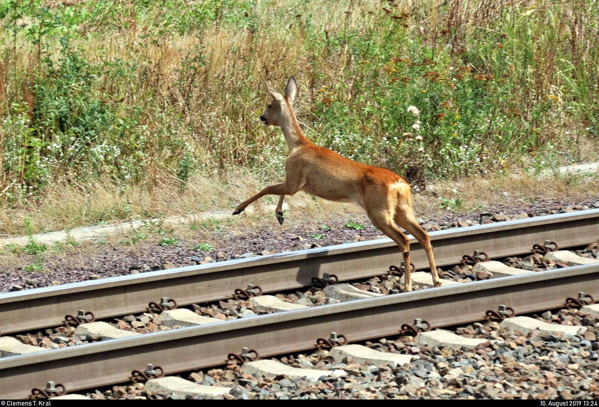 Als der nächste Güterzug herannahte, wollte ein Reh es noch einmal wissen und überquerte die Gleise des Bahnhofs Rodleben auf der Bahnstrecke Trebnitz–Leipzig (KBS 254).