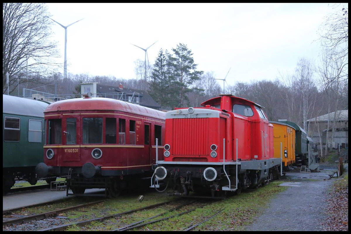 Osnabrück Piesberg Zechenbahnhof am 15.12.2019: Die seitens der DB bei den Osnabrücker Dampflokfreunden hinterstellte 212077-2 hatte an diesem Tag den in Aufarbeitung befindlichen VT 60531 zum Nachbarn. Gerd Hahn