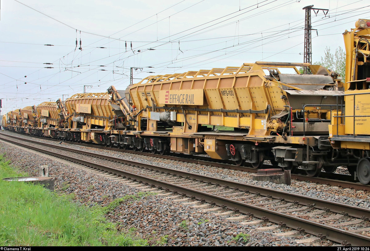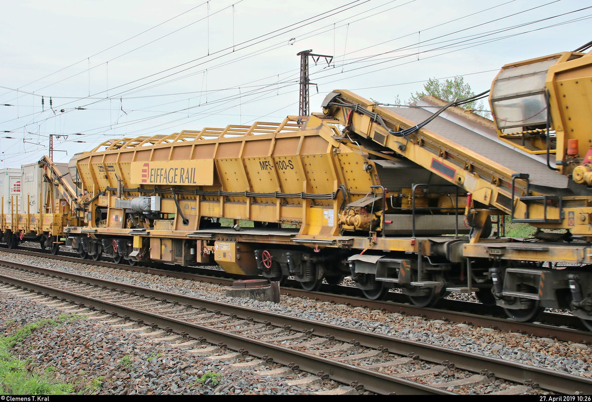 Blick auf eine Materialförder- und Siloeinheit Plasser & Theurer MFS 100 S (99 80 9552 009-9 D-ERD) der Eiffage Rail Niederlassung der Eiffage Infra-Bau SE, die in einem Bauzug mit 218 469-5 "Betty Boom" der Railsystems RP GmbH eingereiht ist und, von Naumburg(Saale)Hbf kommend, in Großkorbetha auf der Bahnstrecke Halle–Bebra (KBS 580) fährt.