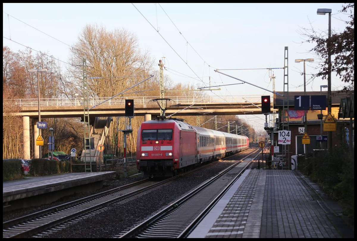 Am 19.12.2019 um 9.47 Uhr fährt hier ein ICE 1 aus Osnabrück kommend durch den wieder eröffneten Streckenbereich der Rollbahn im Bahnhof Natrup Hagen. Der Bahnhof NH wurde dabei zurück gebaut und hat November 2019 keine Weichen mehr! Er wird von Osnabrück aus fern gesteuert und ist unbesetzt! Gerd Hahn