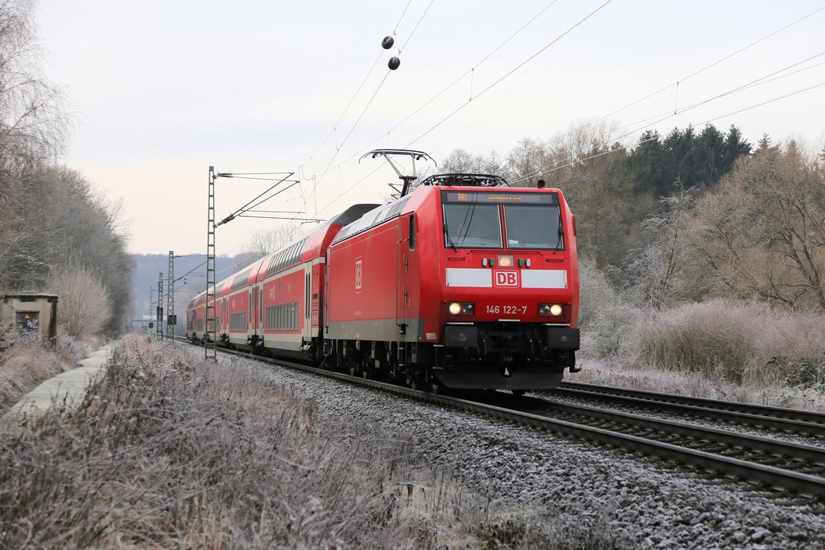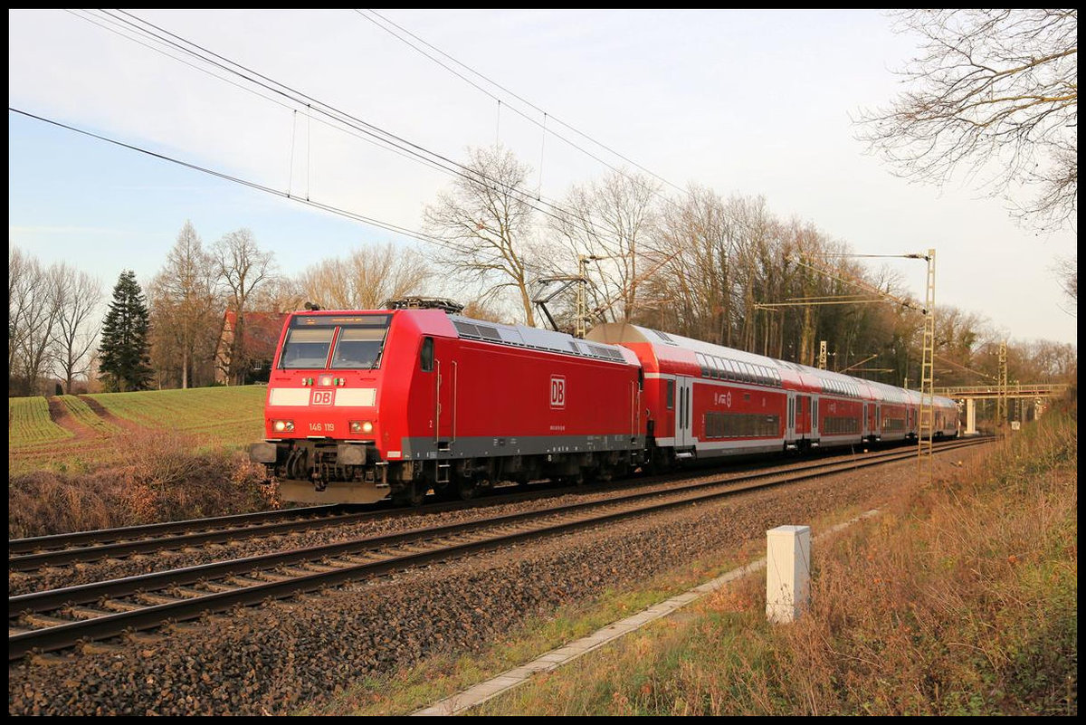 146119 hat am 17.12.2019 mit dem RE 2 nach Düsseldorf soeben Hasbergen verlassen und ist hier am Ortsrand um 14.59 Uhr auf der Rollbahn unterwegs. Gerd Hahn