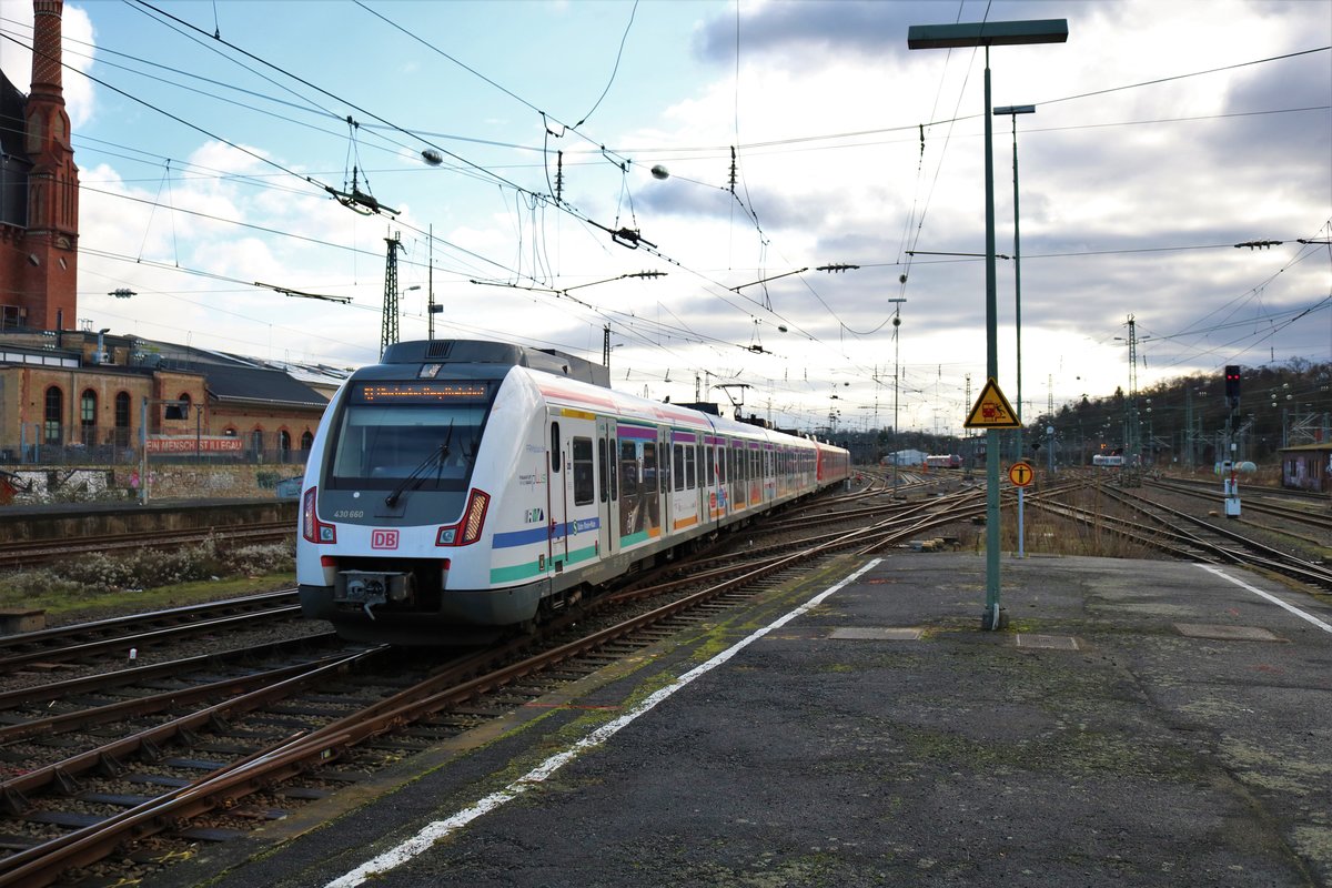 430 100 zusammen mit zwei weiteren 430ern auf dem Weg als S1 nach Wiesbaden Hbf beim Zwischenstopp in Frankfurt-Nied. Aufgenommen am 5.2.2019 17:18 Br111 Fan