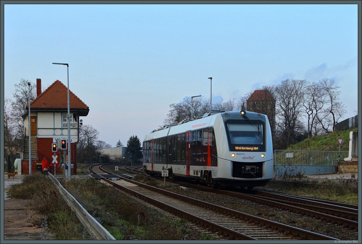 1648 417 passiert als RB 48 Magdeburg - Bernburg das 1915 errichtete Stellwerk der Abzweigstelle Bernburg-Waldau. Hier trennen sich die Strecken nach Güsten und Calbe. (08.12.2020) Christopher Pätz