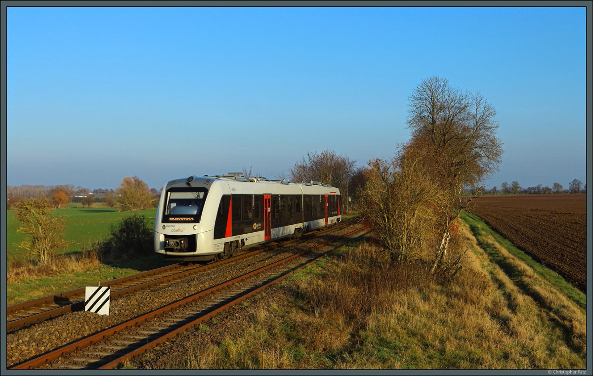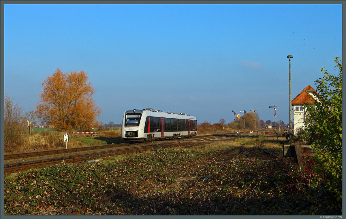 1648 901 rollt am 08.12.2020 an den Formsignalen der westlichen Ausfahrgruppe des Bahnhofs Blumenberg vorbei Richtung Oschersleben. Der einstige Nebenbahnknoten wird von drei mechanischen Stellwerken der Bauform Zimmermann&Buchloh bedient. Rechts ist das Stellwerk W 3 zu sehen, das auch eine Vollschranke bedient. Im Vordergrund ist - bedeckt von Brombeerranken - das Gleis der 1999 stillgelegten Strecke nach Schönebeck zu erkennen. Christopher Pätz