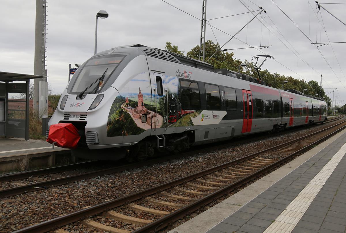 Abellio 9442612 hält hier auf der Fahrt nach Sangerhausen am 26.8.2020 um 17.07 Uhr im Haltepunkt Wanzleben am See. Der Triebwagen trägt eine schöne Werbung für die Harzquerbahn und das Kyffhäuser Denkmal! Gerd Hahn