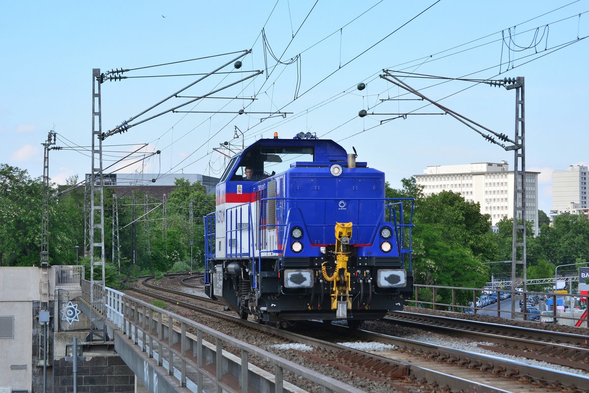 Hybrid Rangierlok SBB Cargo International Alstom H3 1002 035-6 in Offenbach Gbf 06.06.20 von einer Brücke aus fotografiert per Zoom