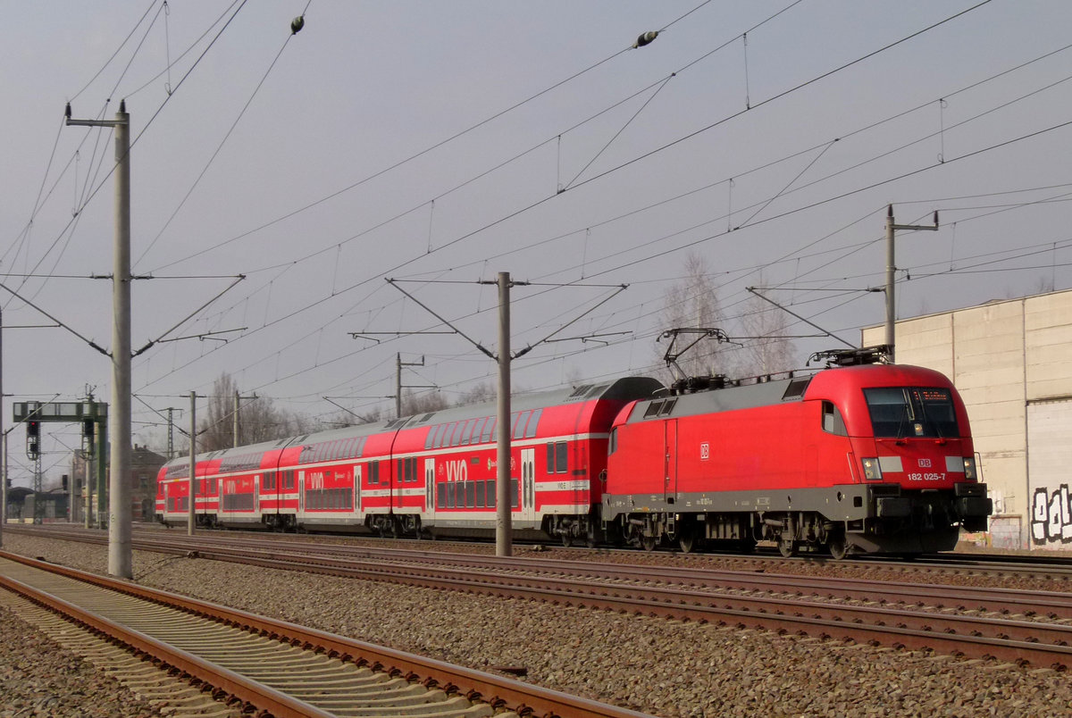 09. September 2013, In der Nähe des ehemaligen Güterbahnhofes Dresden-Niedersedlitz fährt ein Zug der Linie S1 in Richtung Dresden-Hauptbahnhof. Lok 182 025 schiebt. Jürgen Krause