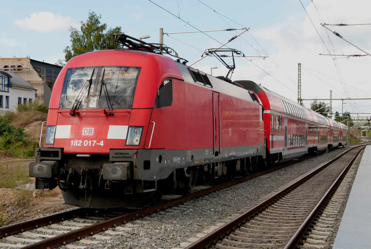 28. September 2012, Im Regelspurteil des Bahnhofs Radebeul-Ost wird der Nahverkehr wegen umfangreicher Bauarbeiten an (im Bild vom Zug verdeckten) Behelfsbahnsteigen abgewickelt. Soeben ist Lok 182 017 mit einer S-Bahn nach Schöna eingefahren. Jürgen Krause