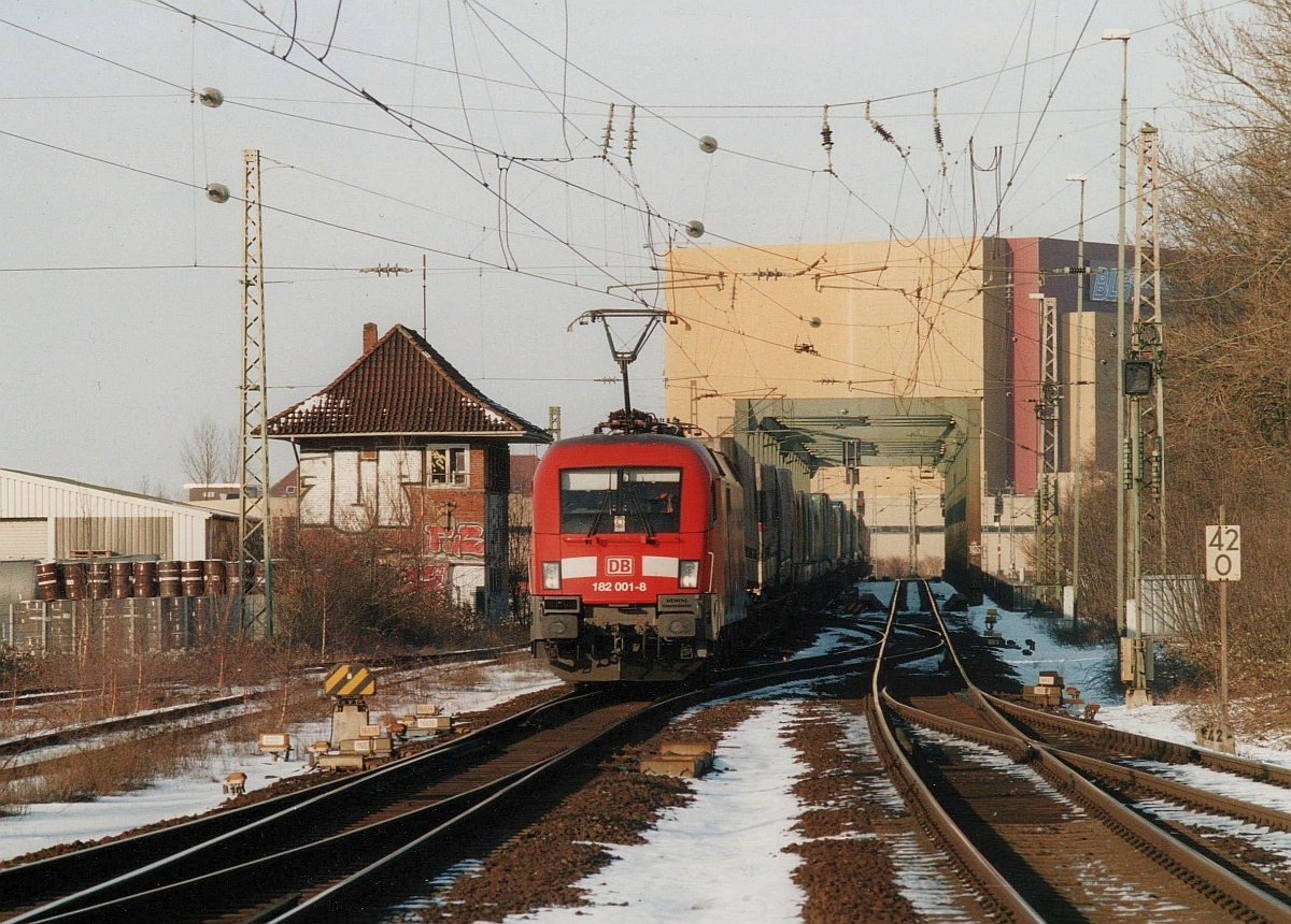 Am 6.3.2005 erreicht DB-Taurus 182 001 - noch standesgemäß im hochwertigen Güterverkehr eingesetzt - mit einem KLV-Zug von Verona QE nach Bremen-Grolland den Bahnhof Bremen-Neustadt. Markus Engel