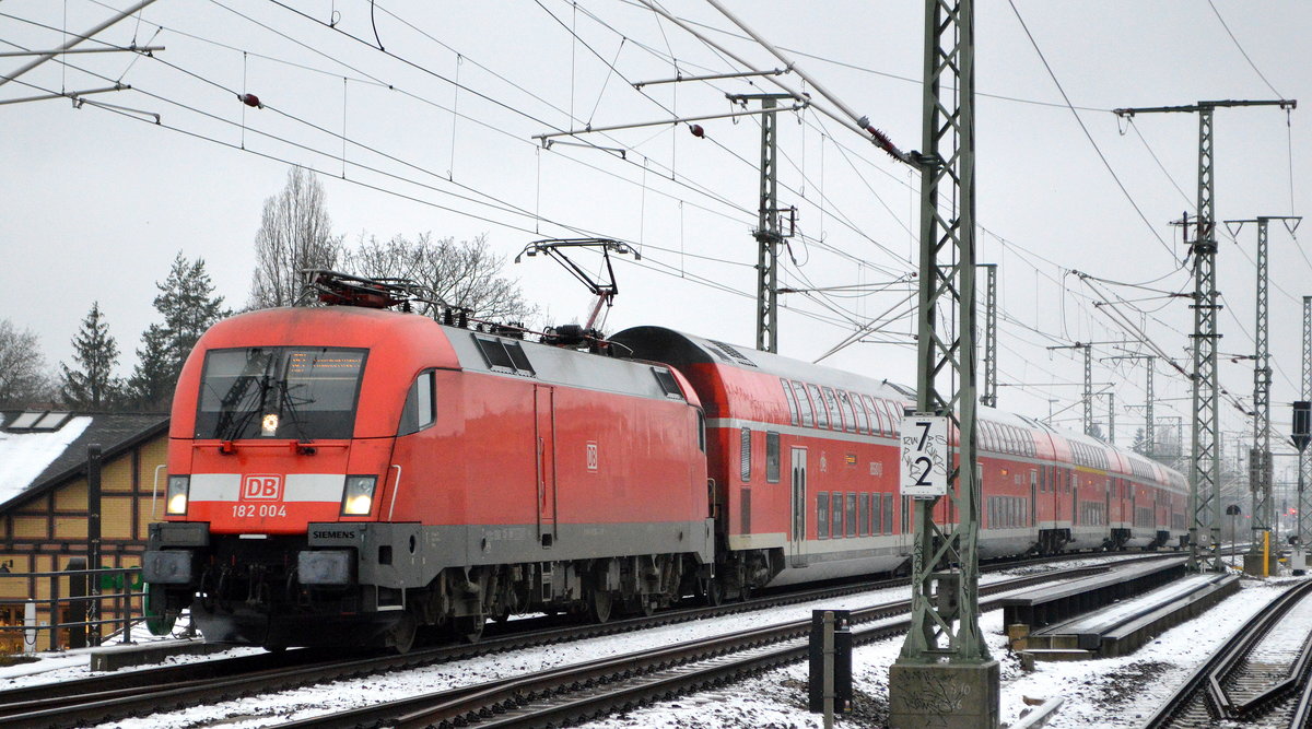 DB Regio Nordost mit dem RE1 nach Frankfurt/Oder mit "182 004" [NVR-Nummer: 91 80 6182 004-2 D-DB] bei winterlichem Wetter am 04.01.21 Berlin Karlshorst. Lothar Stöckmann