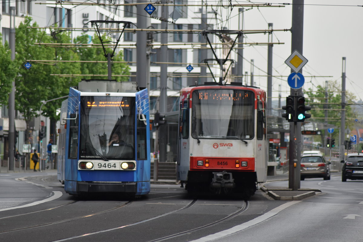Die Bonner Fahrzeuge 7459 und 7759 als umgeleitete Linie 16 auf dem Weg nach Bonn Bad Godesberg auf dem Bahnübergang Gustav-Heinemann-Ufer am 23.02.2020.