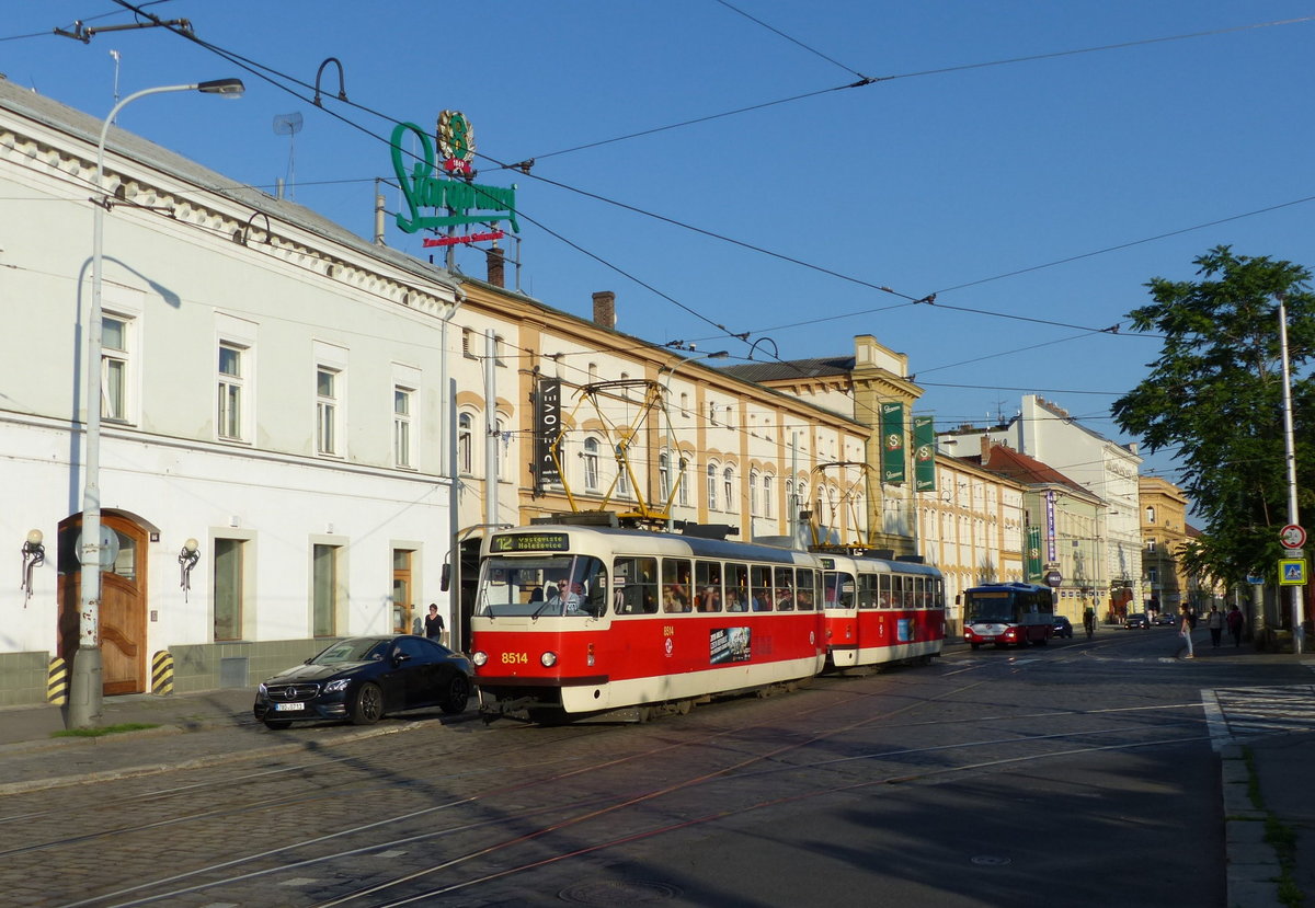 07. August 2010, Prag im Dauerregen. Die Straßenbahn kreuzt den Wenzelsplatz. Im Rahmen einer grundlegenden Modernisierung wurde in den Jahren 2005 bis 2015 alle Triebwagen der Baureihe KT8D5 umgebaut. Der Mittelteil (C-Teil) erhielt zwischen den Drehgestellen einen niederflurigen Boden. Jürgen Krause