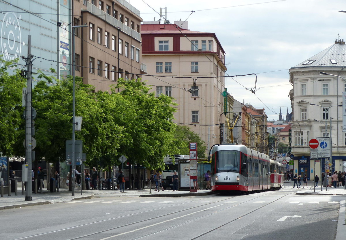 07. August 2010, Prag im Dauerregen. Die Straßenbahn kreuzt den Wenzelsplatz. Die Škoda 14 T sind (teilweise) niederflurige sechsachsige Multigelenkwagen in Einrichtungsbauart. Sie werden in Prag seit 2006 im Linienbetrieb eingesetzt. Hersteller ist Škoda Transportation Pilsen. Das Design entwarf Porsche Design. Die fünfteiligen Garnituren haben einen Gesamtlänge von 30 m, bieten Platz für 269 Fahrgäste und sind für eine Höchstgeschwindigkeit von 60 km/h zugelassen. Es befinden sich 60 Wagen mit den Nummern 9111 bis 9170 im Einsatz. (Quelle Wiki) Jürgen Krause