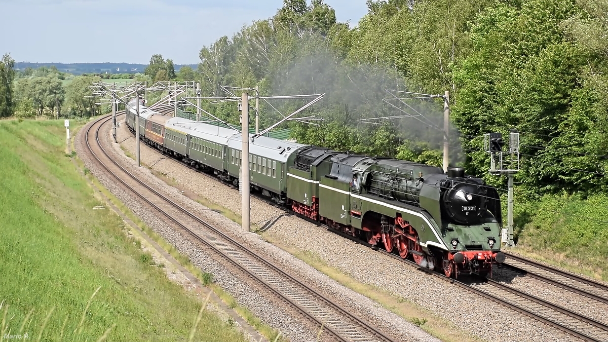 18 201 war im Rahmen der Sonderfahrt "Mit Öl und Kohle zum Wiener Prater" am 10.5.2018 auf dem Weg nach Wien und konnte bei der Durchfahrt durch Vierkirchen aufgenommen werden. Mario Rossi