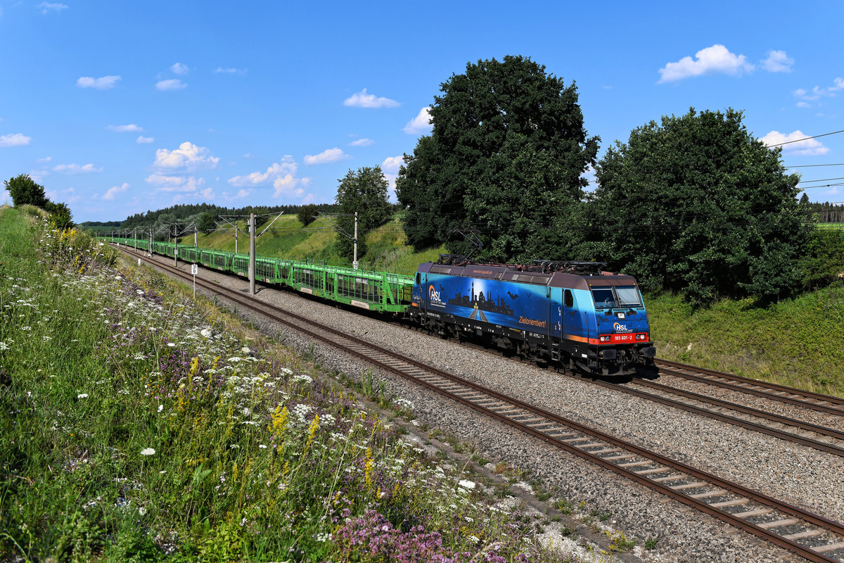 Die HSL läßt sich im Münchner Raum selten blicken. Um so erfreulicher war es, dass am 20. Juli 2020 der umgeleitete DGS 45985 von Würzburg Zell nach Graz den Weg über die bayerische Landeshauptstadt nahm. Der leere Autotransportzug wurde nämlich von der interessant gestalteten 185 601 befördert. Das Design erinnert daran, dass Güterzüge mehrheitlich nachts verkehren, wenn die Gleise frei von Personenverkehr sind. Christoph Schneider