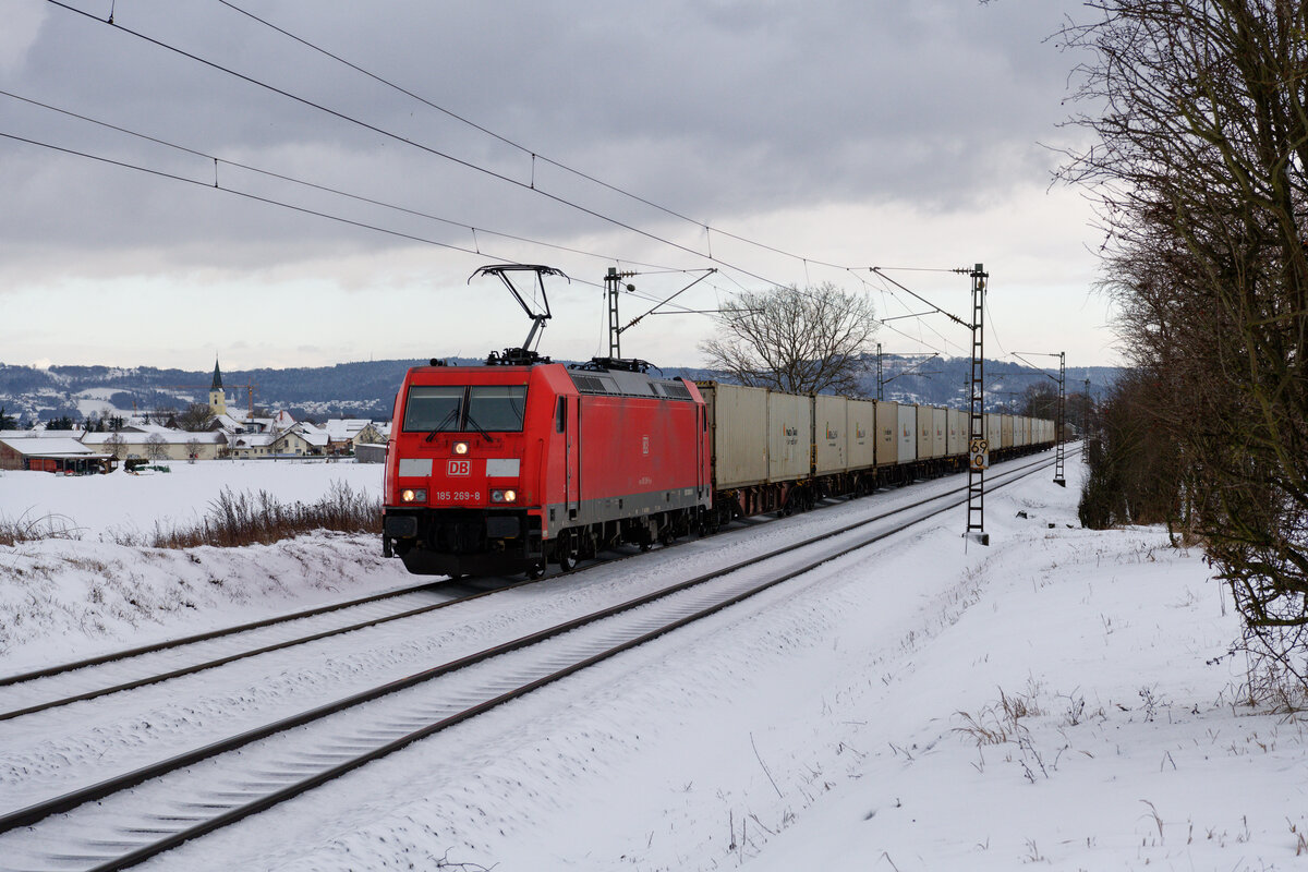 185 269 DB Cargo mit einem Zuckerzug bei Pölling Richtung Nürnberg, 13.01.2020