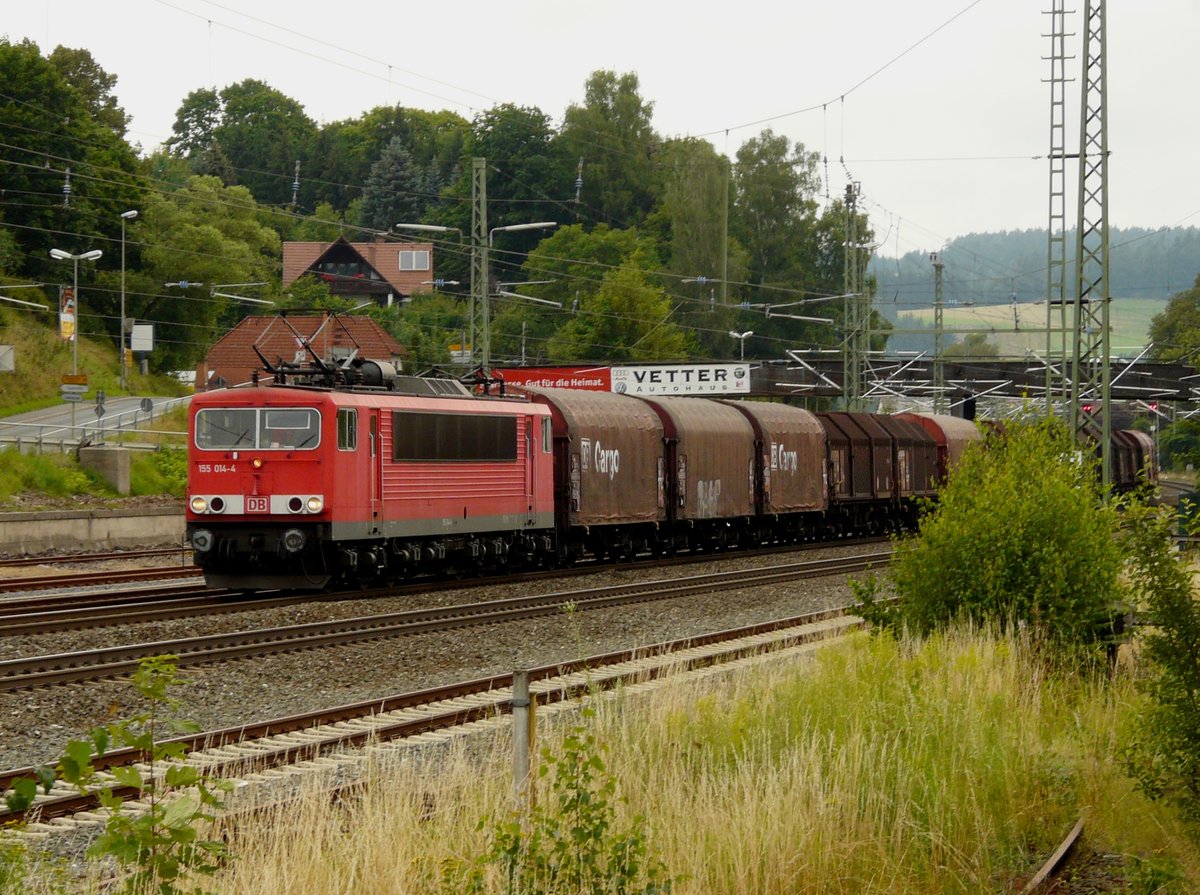 22. Juli 2014, Lok 155 033 muss mit ihrem Güterzug in Richtung Saalfeld heute auf dem "falschen" Gleis durch den Haltepunkt Küps fahren. Am Bahnsteig 1 erwarten Reisende die Regionalbahn nach Kronach - Saalfeld. Jürgen Krause