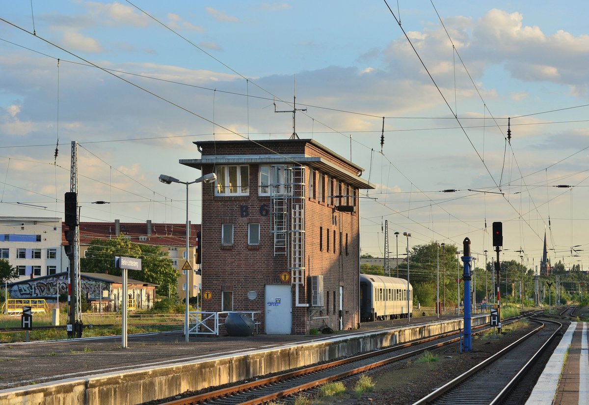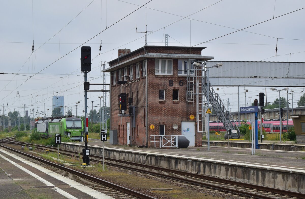 Blick auf das Stellwerk B6 in Berlin Lichtenberg. Im Abstelgleis dahinter befindet sich 193 231 im Flixtrain Outfit und eine ELL 193er.