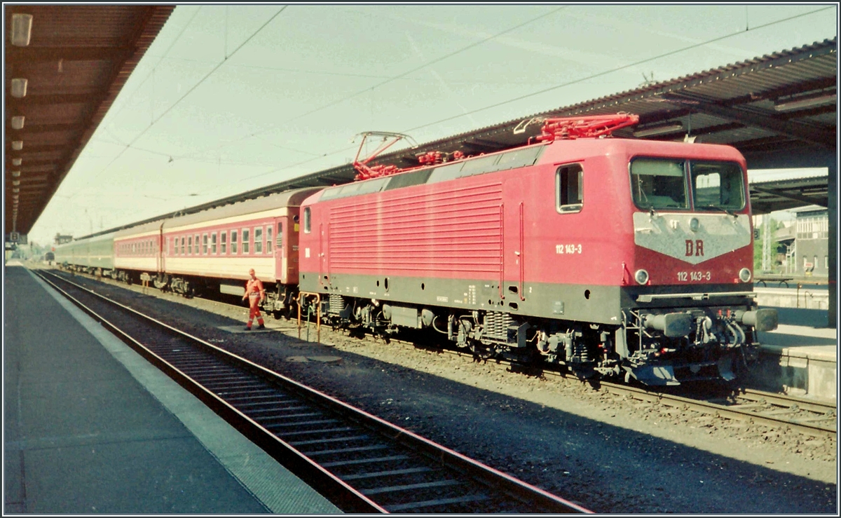 Die DR 112 143-3 wartet mit einem Nachtschnellzug nach Villnus und Kiew in Berlin Lichtenberg auf die Abfahrt.