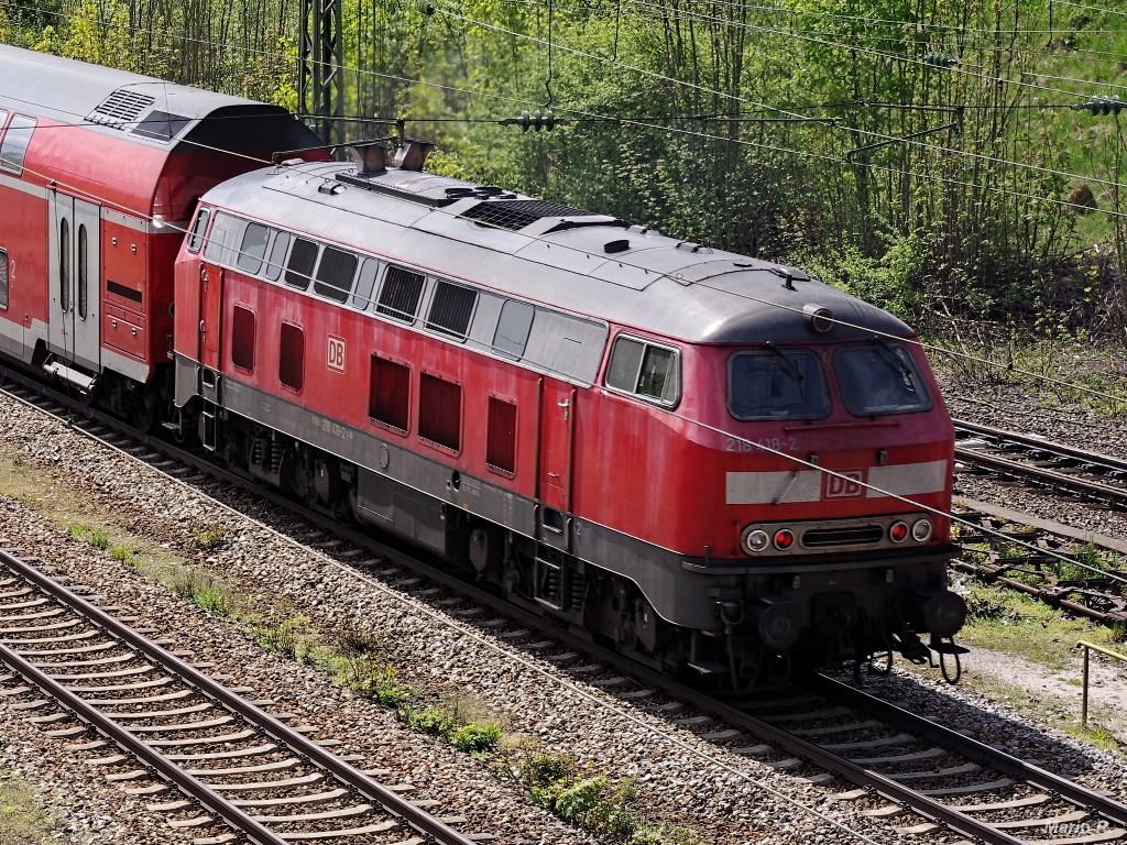 Auf der Bahnstrecke München-Mühldorf verkehren traditionell Doppelstockzüge der Südostbayernbahn in verschiedenen Längen. 218 418 beschleunigt hier eine "normale" Gefäßgröße als RB nach Mühldorf am Inn aus Markt Schwaben. Aufgenommen am 4.5.13 Mario Rossi