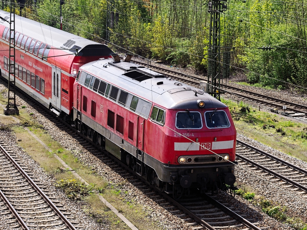Dieselklassiker trifft moderne: 218 418 schiebt fünf Doppelstockwagen der Südostbayernbahn aus dem Bahnhof Markt Schwaben nach München. Aufgenommen am Nachmittag des 4.5.2013 Mario Rossi