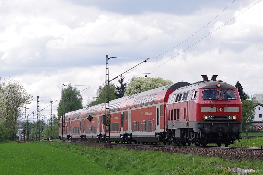 Im Jahr 2013 noch in fester Hand der BR 218: Die Regionalbahnen der Südostbayernbahn auf der Strecke München-Mühldorf. Bei Markt Schwaben konnte am 4.5.2013 218 404 mit ihren fünf Doppelstockwagen am Doppelbahnübergang von Markt Schwaben aufgenommen werden Mario Rossi